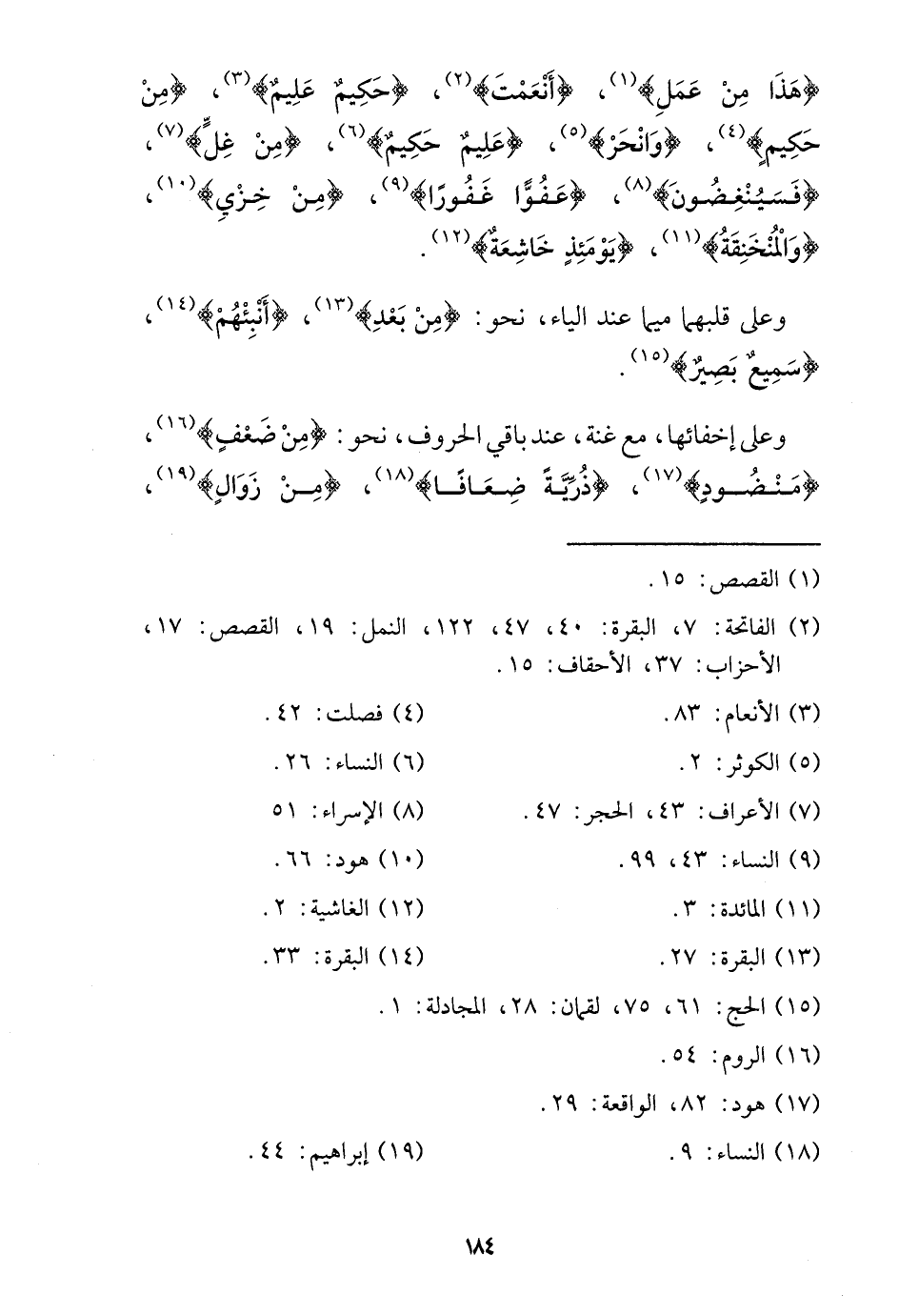{هَذَا من عمل} ، {أَنْعَمت} ، {حَكِيم عليم} ، {من حَكِيم} ، {وانحر} ، {عليم حَكِيم} ، {من غل} ، {فسينغضون} ، {عفوا غَفُورًا} ، {من خزي} ، {والمنخنقة} ، {يَوْمئِذٍ خاشعة} .