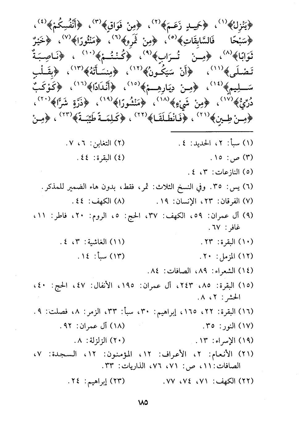 {ينزل} ، {حميد زعم} ، {من فوَاق} ، {أَنفسكُم} ، {سبحاً فالسابقات} ، {من ثمره} ، {منثوراً} ، {خير ثَوابًا} ، {من تُرَاب} ، {كُنْتُم} ، {ناصبة تصلى} ، {أَن سَيكون} ، {منسأته} ، {بقلب سليم} ، {من دِيَارهمْ} ، {أنداداً} ، {كَوْكَب دري} ، {من شَيْء} ، {منشوراً} ، {ذرة شرا} ، {من طين} ، {فَانْطَلقَا} ، {كلمة طيبَة} ، (من