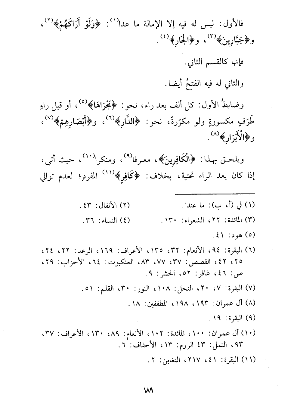 وَضَابِط الأول: كل ألف بعد رَاء، نَحْو: {مجْراهَا} ، أَو قبل رَاء طرف مَكْسُورَة وَلَو مكررة، نَحْو: {الدَّار} ، و {أَبْصَارهم} ، و {الْأَبْرَار} .