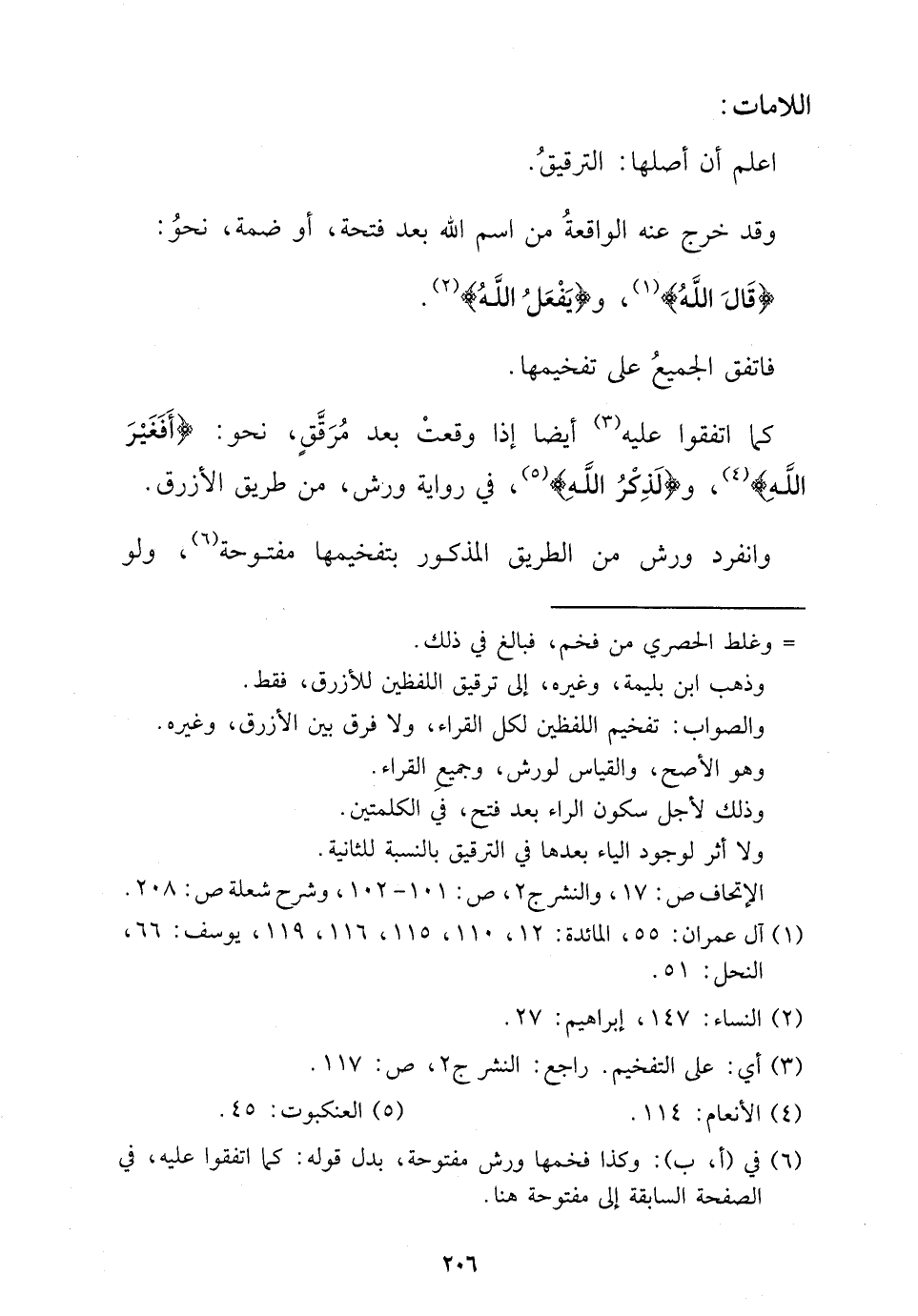 كَمَا اتَّفقُوا عَلَيْهِ أَيْضا إِذا وَقعت بعد مرقق، نَحْو: {أفغير الله} ، و {لذكر الله} ، فِي رِوَايَة ورش، من طَرِيق الْأَزْرَق.