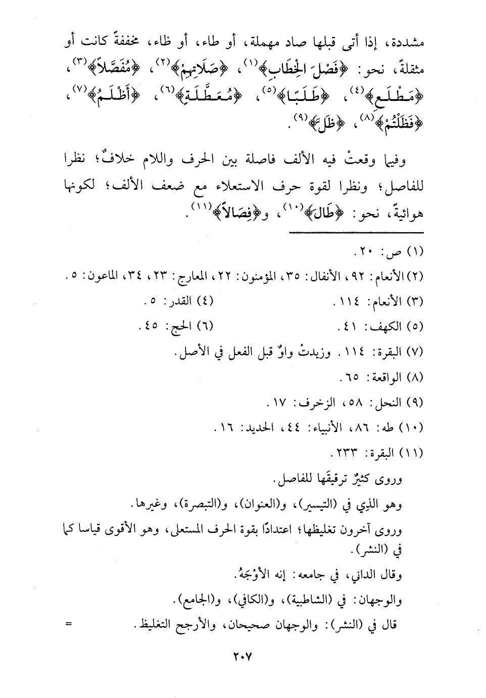 وَفِيمَا وَقعت فِيهِ الْألف فاصلة بَين الْحَرْف وَاللَّام خلاف؛ نظرا للفاصل؛ ونظرا لقُوَّة حرف الاستعلاء مَعَ ضعف الْألف؛ لكَونهَا هوائية، نَحْو: {طَال} ، و {فصالا} .