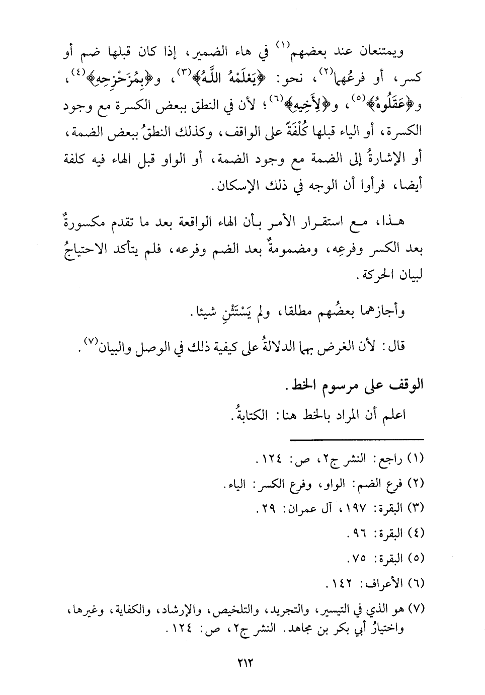 هَذَا، مَعَ اسْتِقْرَار الْأَمر بِأَن الْهَاء الْوَاقِعَة بعد مَا تقدم مَكْسُورَة بعد الْكسر وفرعه، ومضمومة بعد الضَّم وفرعه، فَلم يتَأَكَّد الِاحْتِيَاج لبَيَان الْحَرَكَة.