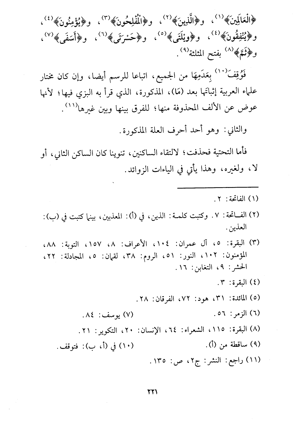 {الْعَالمين} ، و {الَّذين} ، و {المفلحون} ، و {يُؤمنُونَ} ، و {يُنْفقُونَ} ، و {يلتى} ، و {حسرتى} ، و {أسفى} ، و {ثمَّ} بِفَتْح الْمُثَلَّثَة.