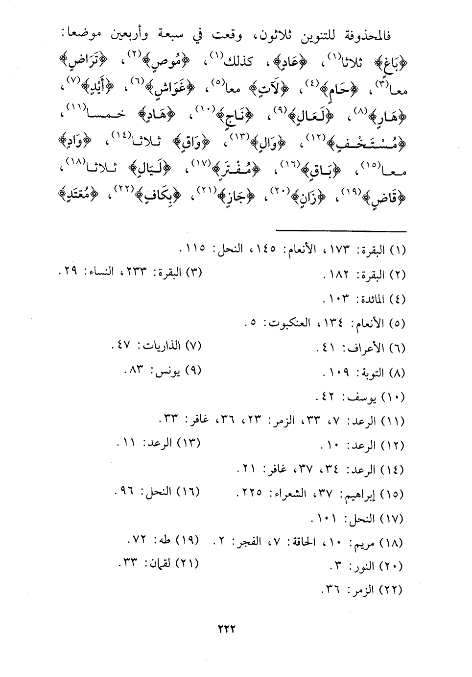 فالمحذوفة للتنوين ثَلَاثُونَ، وَقعت فِي سَبْعَة وَأَرْبَعين موضعا: {بَاغ} ثَلَاثًا، {عَاد} ، كَذَلِك، {موص} ، {ترَاض} مَعًا، {حام} ، {لآت} مَعًا، {غواش} ، {أيد} ، {هار} ، {لعال} ، {نَاجٍ} ، {هاد} خمْسا، {مستخف} ، {وَال} ، {واق} ثَلَاثًا، {وَاد} مَعًا، {بَاقٍ} ، {مفتر} ، {لَيَال} ثَلَاثًا، {قَاض} ، {زَان} ، {جَازَ} ، {بكاف} ، {مُعْتَد}