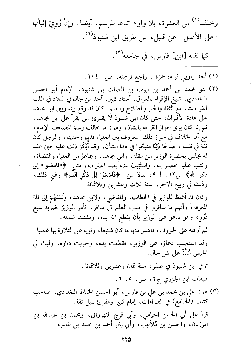 وَخلف من الْعشْرَة، بِلَا وَاو؛ اتبَاعا للرسم، أَيْضا. وَإِن رُوِيَ إِثْبَاتهَا - على الأَصْل - عَن قنبل، من طَرِيق ابْن شنبوذ.