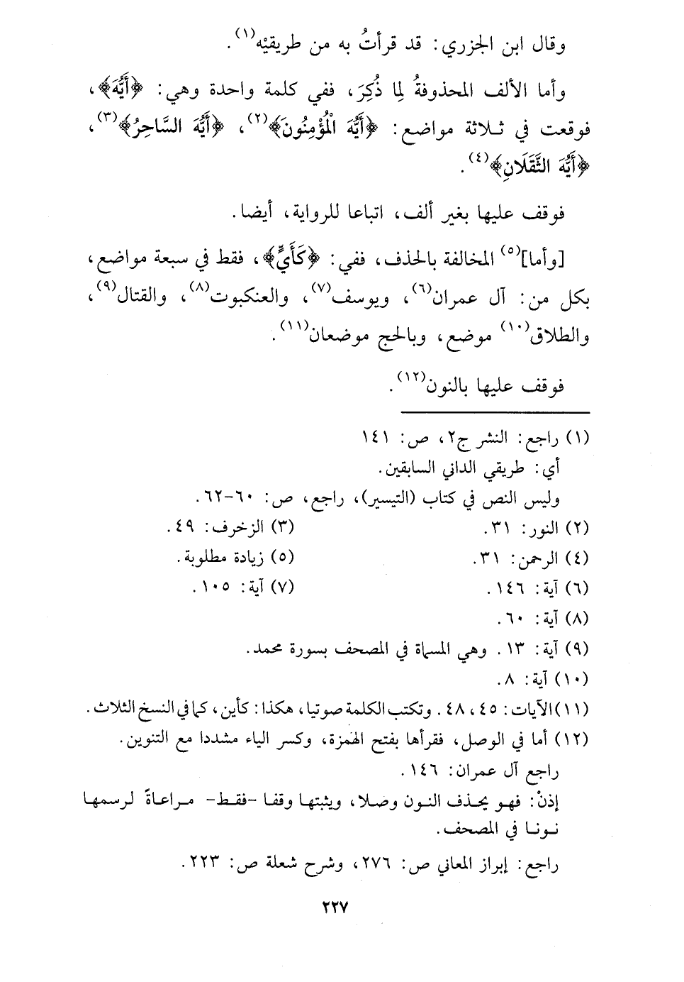 وَأما الْألف المحذوفة لما ذكر، فَفِي كلمة وَاحِدَة، وَهِي: {أيه} ، فَوَقَعت فِي ثَلَاثَة مَوَاضِع: {أيه الْمُؤْمِنُونَ} ، {أيه السَّاحر} ، {أيه الثَّقَلَان} .