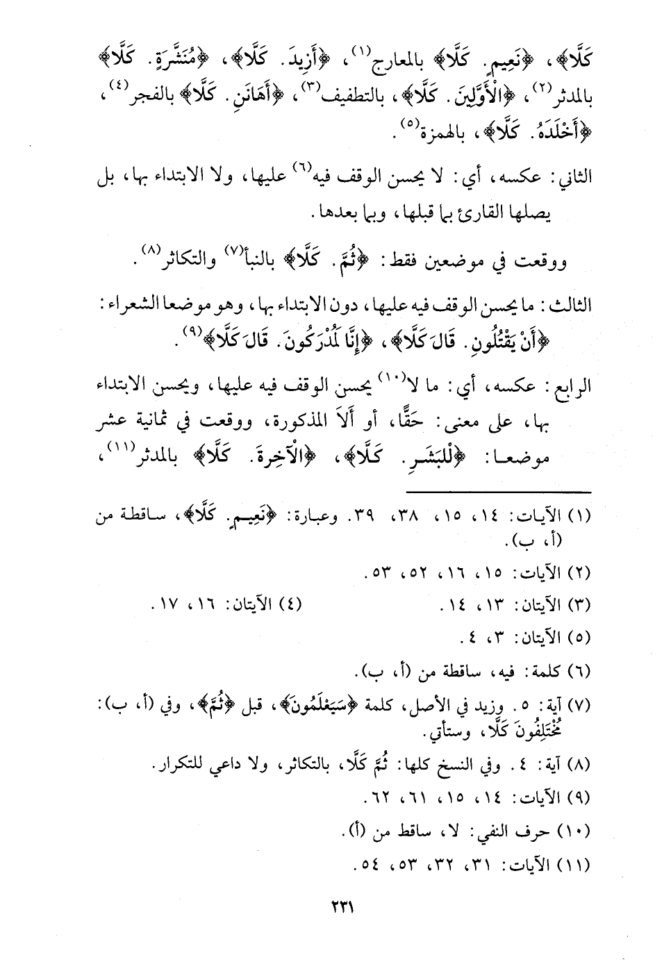 الرَّابِع: عَكسه، أَي: مَا لَا يحسن الْوَقْف فِيهِ عَلَيْهَا، وَيحسن الِابْتِدَاء بهَا، على معنى: حَقًا، أَو أَلا الْمَذْكُورَة، وَوَقعت فِي ثَمَانِيَة عشر موضعا: {للبشر. كلا} ، {الْآخِرَة. كلا} بالمدثر،