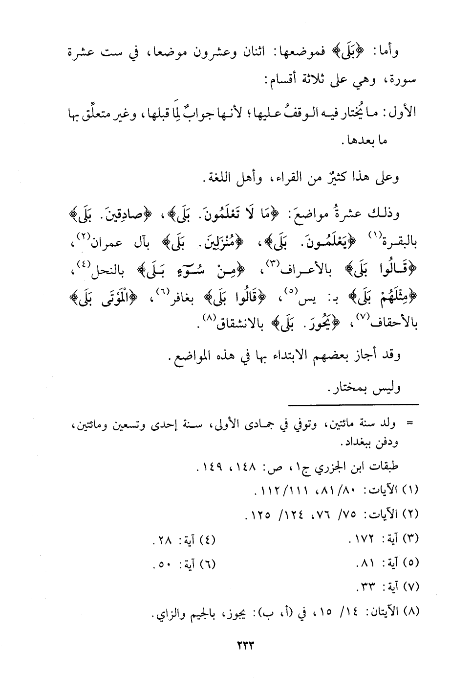 وَأما: {بلَى} فموضعها: اثْنَان وَعِشْرُونَ موضعا، فِي سِتّ عشرَة سُورَة، وَهِي على ثَلَاثَة أَقسَام: