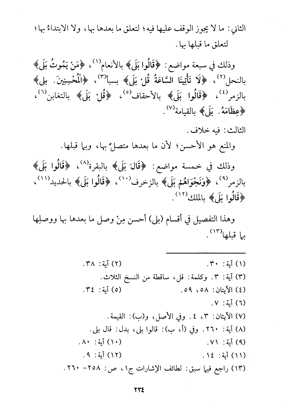 وَذَلِكَ فِي سَبْعَة مَوَاضِع: {قَالُوا بلَى} بالأنعام، {من يَمُوت بلَى} بالنحل، {لَا تَأْتِينَا السَّاعَة قل بلَى} بسبأ، {الْمُحْسِنِينَ. بلَى} بالزمر، {قَالُوا بلَى} بالأحقاف، {قل بلَى} بالتغابن، {عِظَامه. بلَى} بالقيامة.