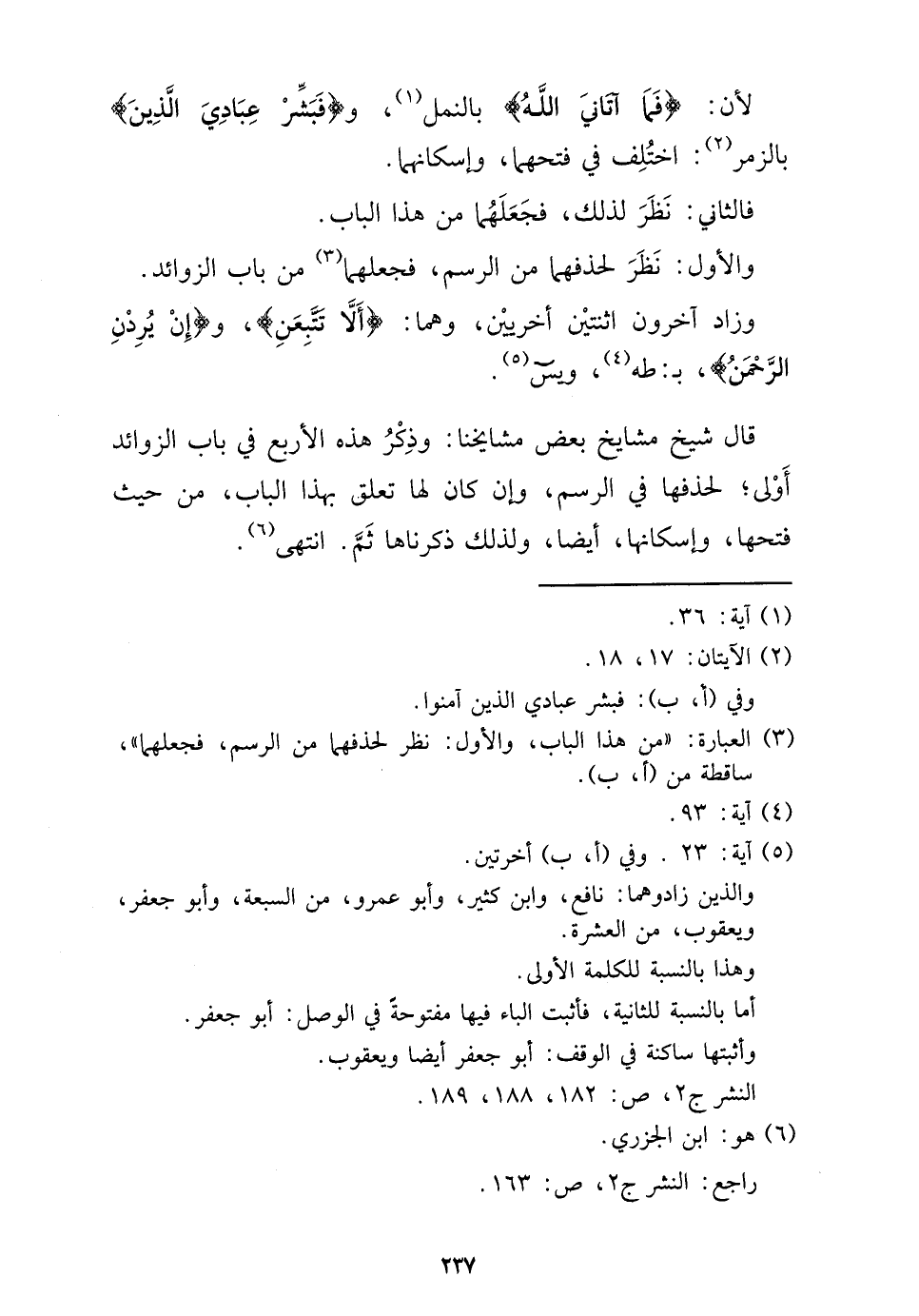 قَالَ شيخ مَشَايِخ بعض مَشَايِخنَا: وَذكر هَذِه الْأَرْبَع فِي بَاب الزَّوَائِد أولى؛ لحذفها فِي الرَّسْم، وَإِن كَانَ لَهَا تعلق بِهَذَا الْبَاب، من حَيْثُ فتحهَا، وإسكانها، أَيْضا، وَلذَلِك ذَكرنَاهَا ثمَّ. انْتهى.
