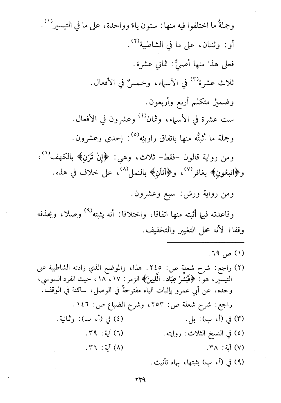 وَجُمْلَة مَا اخْتلفُوا فِيهِ مِنْهَا: سِتُّونَ يَاء وَوَاحِدَة، على مَا فِي التَّيْسِير. أَو: وثنتان، على مَا فِي الشاطبية. فعلى هَذَا مِنْهَا أُصَلِّي: ثَمَانِي عشرَة. ثَلَاث عشرَة فِي الْأَسْمَاء، وَخمْس فِي الْأَفْعَال. وَضمير مُتَكَلم أَربع وَأَرْبَعُونَ. سِتّ عشرَة فِي الْأَسْمَاء، وثمان وَعِشْرُونَ فِي الْأَفْعَال. وَجُمْلَة مَا أثْبته مِنْهَا بِاتِّفَاق راوييه: إِحْدَى وَعِشْرُونَ.