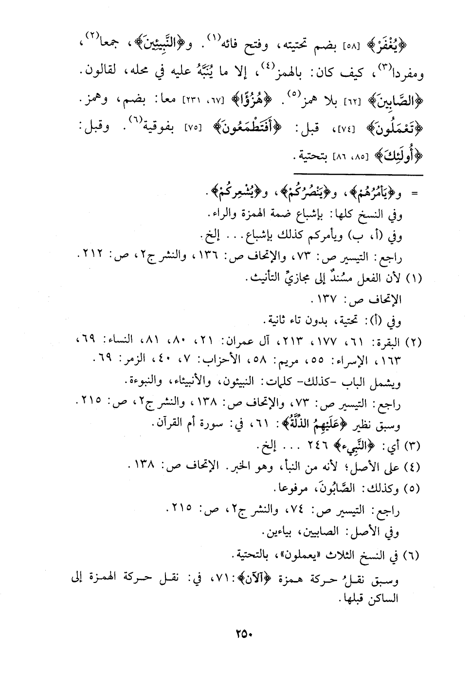 {يغْفر} بِضَم تحتيته، وَفتح فائه. و {النبيئين} ، جمعا، ومفردا، كَيفَ كَانَ: بِالْهَمْز، إِلَّا مَا يُنَبه عَلَيْهِ فِي مَحَله، لقالون. {الصابين} بِلَا همز. {هزؤا} مَعًا: بِضَم، وهمز. {تَعْمَلُونَ} ، قبل: {أفتطعمون} بفوقية. وَقبل: {أُولَئِكَ} بتحتية.