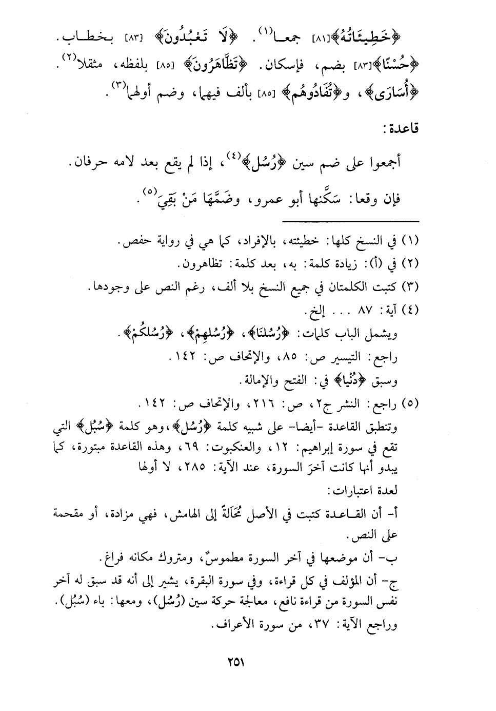 {خطيئاته} جمعا. {لَا تَعْبدُونَ} بخطاب. {حسنا} بِضَم، فإسكان. {تظاهرون} بِلَفْظِهِ، مُثقلًا. {أُسَارَى} ، و {تفادوهم} بِأَلف فيهمَا، وَضم أَولهمَا.