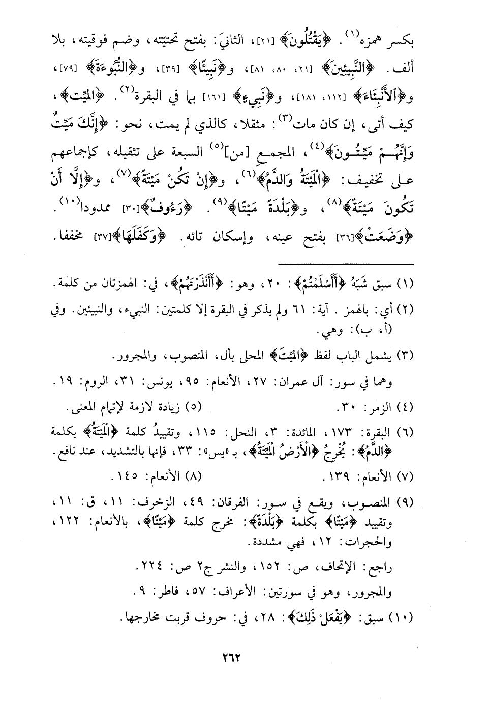 بِكَسْر همزه. {يقتلُون} ، الثَّانِي: بِفَتْح تحتيته، وَضم فوقيته، بِلَا ألف. {النبيئين} ، و {نبيئا} ، و {النبوءة} ، و {الأنبئاء} ، و {نبيء} بِمَا فِي الْبَقَرَة. {الْمَيِّت} ، كَيفَ أَتَى، إِن كَانَ مَاتَ: مُثقلًا، كَالَّذي لم يمت، نَحْو: {إِنَّك ميت وَإِنَّهُم ميتون} ، الْمجمع [من] السَّبْعَة على تثقيله، كإجماعهم على تَخْفيف: {الْميتَة وَالدَّم} ، و {إِن تكن ميتَة} ، و {إِلَّا أَن تكون ميتَة} ، و {بَلْدَة مَيتا} . {رؤوف} ممدودا. {وضعت} بِفَتْح عينه، وَإِسْكَان تائه. {وكفلها} مخففا.