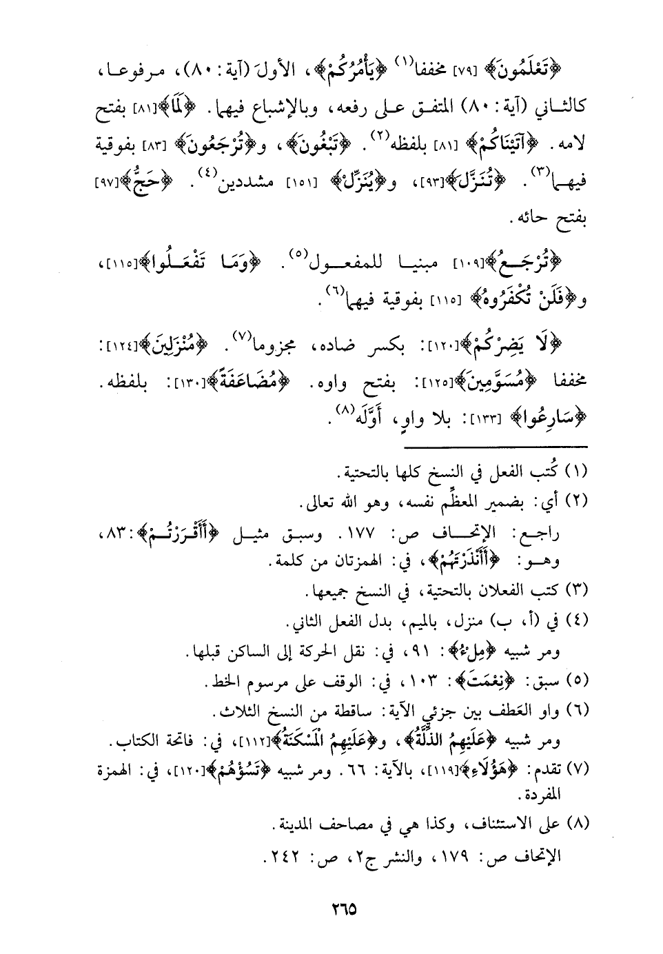 {تعلمُونَ} مخففا {يَأْمُركُمْ} ، الأول (آيَة: 80) ، مَرْفُوعا، كالثاني (آيَة: 80) الْمُتَّفق على رَفعه، وبالإشباع فيهمَا. {لما} بِفَتْح لامه. {آتيناكم} بِلَفْظِهِ. {تبغون} ، و {ترجعون} بفوقية فيهمَا. {تنزل} و {ينزل} مشددين. {حج} بِفَتْح حائه.