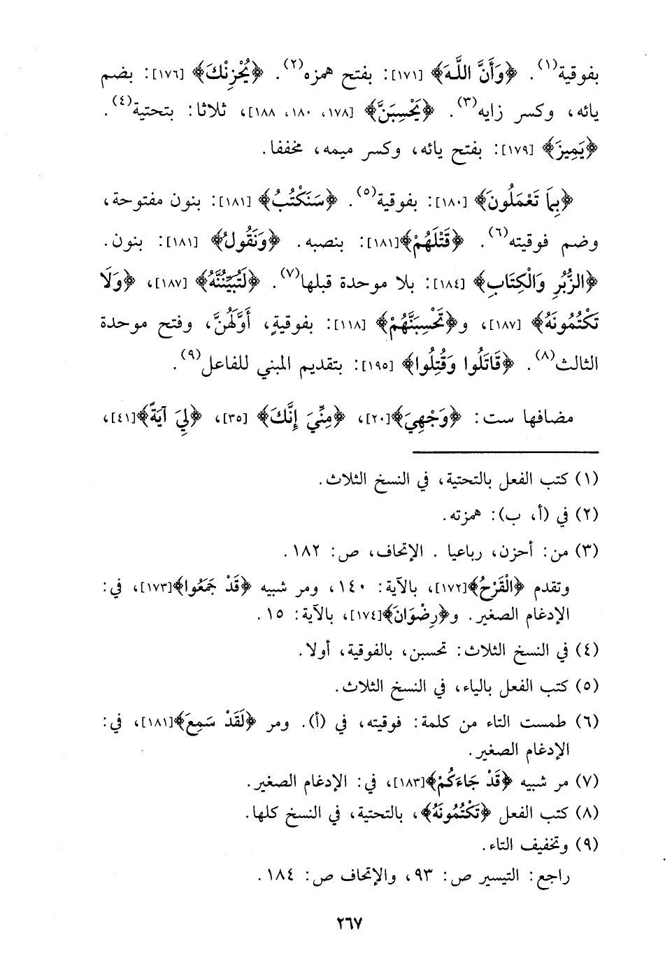 {بِمَا تَعْمَلُونَ} : بفوقية. {سنكتب} : بنُون مَفْتُوحَة، وَضم فوقيته. {قَتلهمْ} : بنصبه. {ونقول} : بنُون. {الزبر وَالْكتاب} : بِلَا مُوَحدَة قبلهَا. {لتبيننه} ، {وَلَا تكتمونه} ، و {تحسبنهم} : بفوقية، أولهنَّ، وَفتح مُوَحدَة الثَّالِث. {قَاتلُوا وَقتلُوا} : بِتَقْدِيم الْمَبْنِيّ للْفَاعِل.