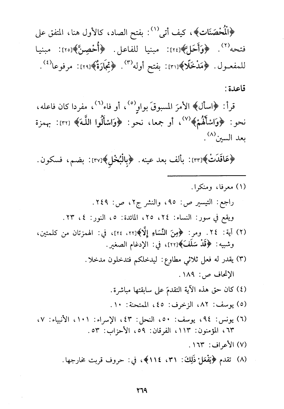{الْمُحْصنَات} ، كَيفَ أَتَى: بِفَتْح الصَّاد، كَالْأولِ هُنَا، الْمُتَّفق على فَتحه. {وَأحل} : مَبْنِيا للْفَاعِل. {أحصن} : مَبْنِيا للْمَفْعُول. {مدخلًا} : بِفَتْح أَوله. {تِجَارَة} : مَرْفُوعا.