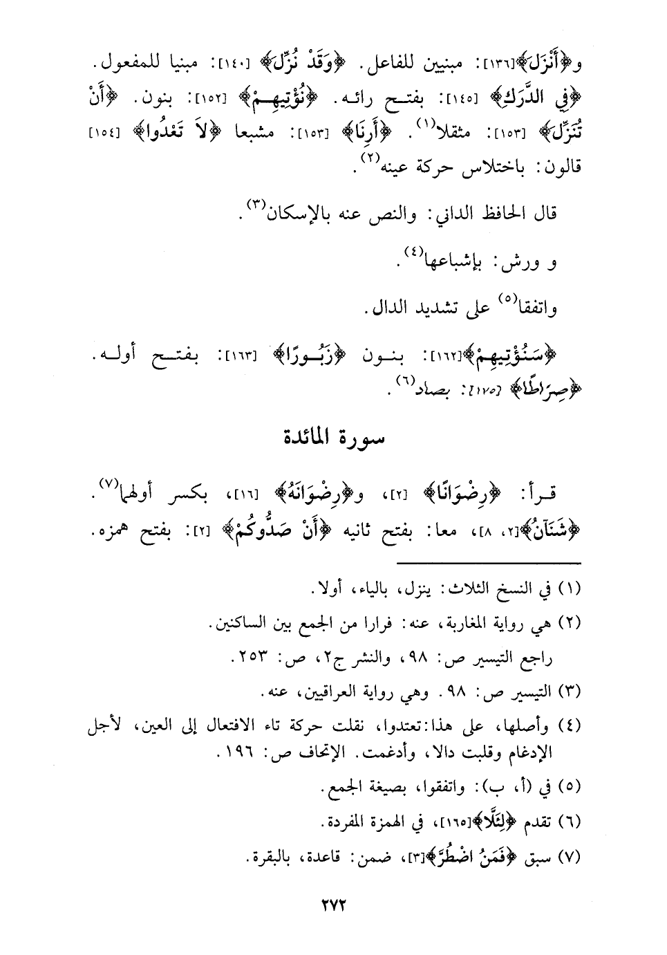 قَرَأَ: {رضوانا} ، و {رضوانه} ، بِكَسْر أَولهمَا. {شنآن} ، مَعًا: بِفَتْح ثَانِيه {أَن صدوكم} : بِفَتْح همزه.