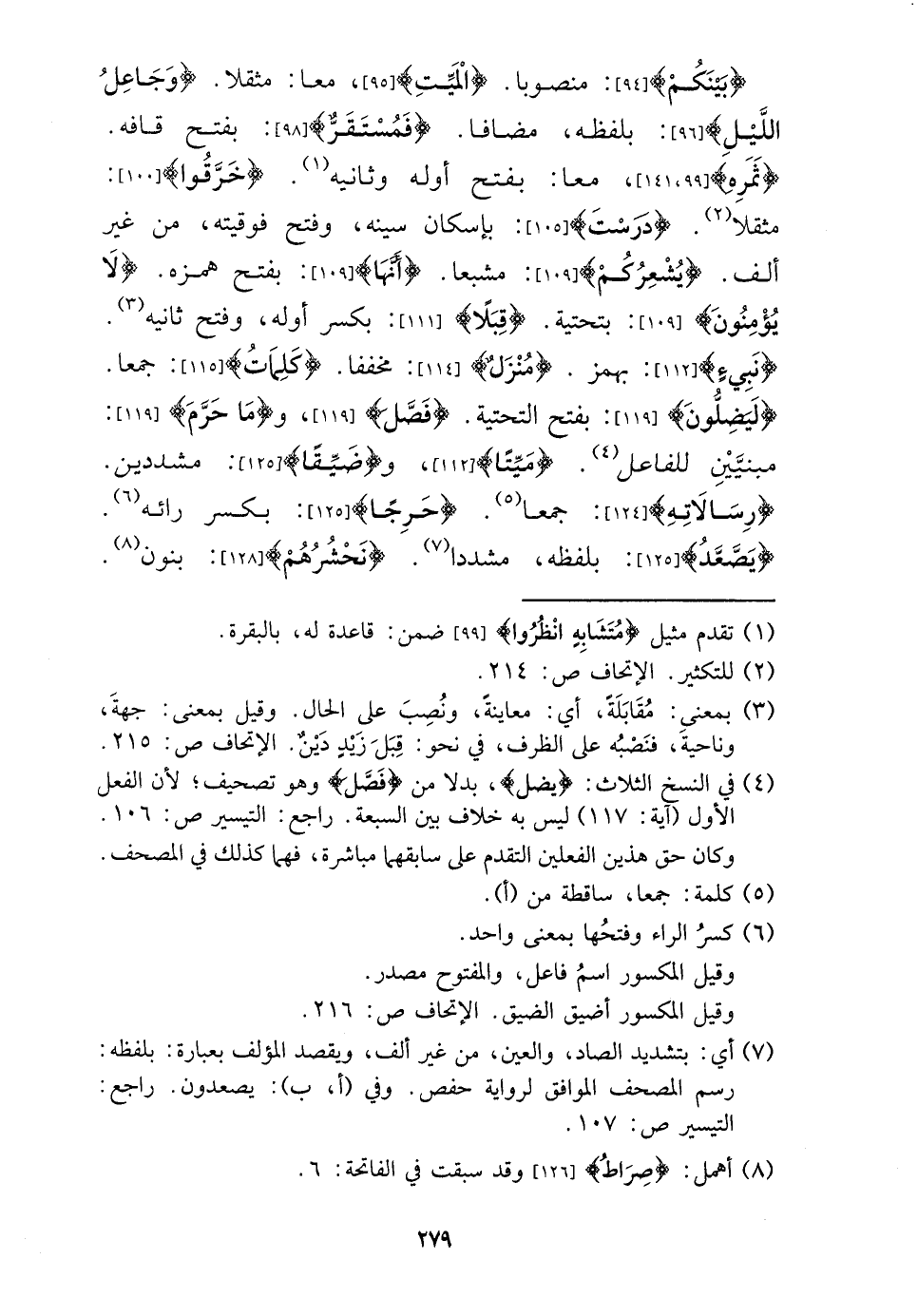 {بَيْنكُم} : مَنْصُوبًا. {الْمَيِّت} ، مَعًا: مُثقلًا. {وجاعل اللَّيْل} : بِلَفْظِهِ، مُضَافا. {فمستقر} : بِفَتْح قافه. {ثمره} ، مَعًا: بِفَتْح أَوله وثانيه. {خرقوا} : مُثقلًا. {درست} : بِإِسْكَان سينه، وَفتح فوقيته، من غير ألف. {يشعركم} : مشبعا. {أَنَّهَا} : بِفَتْح همزه. {لَا يُؤمنُونَ} : بتحتية. {قبلا} : بِكَسْر أَوله، وَفتح ثَانِيه. {نبيء} : بهمز. {منزل} : مخففا. {كَلِمَات} : جمعا. {ليضلون} : بِفَتْح التَّحْتِيَّة. {فصل} و {مَا حرم} : مبنيين للْفَاعِل. {مَيتا} ، و {ضيقا} : مشددين. {رسالاته} : جمعا. {حرجا} : بِكَسْر رائه. {يصعد} : بِلَفْظِهِ، مشددا. {نحشرهم} : بنُون.