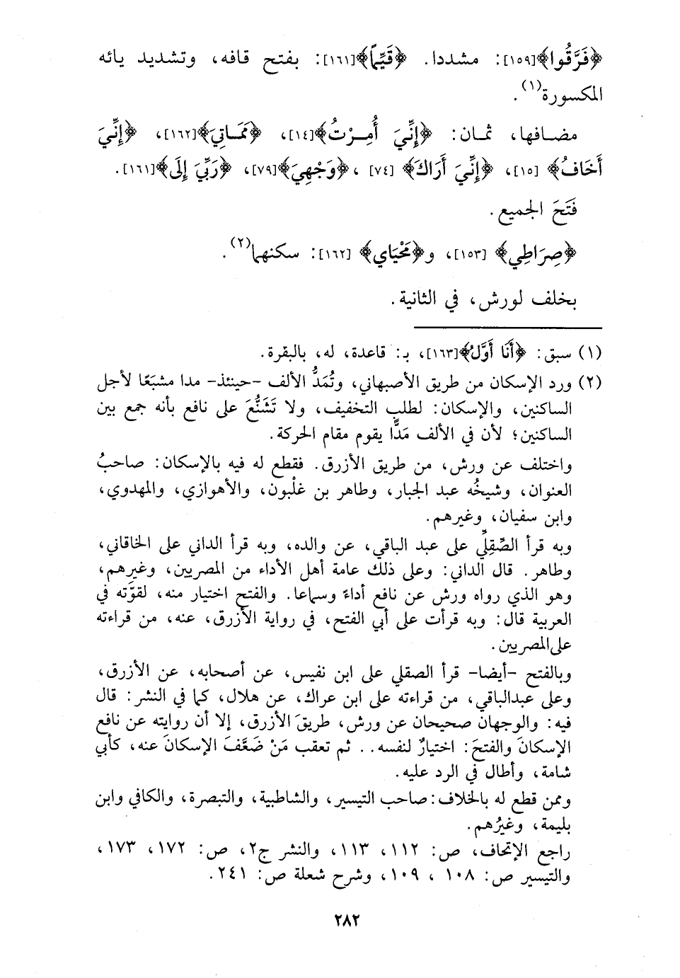 مضافها، ثَمَان: {إِنِّي أمرت} ، {مماتي} ، {إِنِّي أَخَاف} ، {إِنِّي أَرَاك} ، {وَجْهي} ، {رَبِّي إِلَى} . فتح الْجَمِيع. {صِرَاطِي} ، و {محياي} : سكنهما. بخلف لورش، فِي الثَّانِيَة.