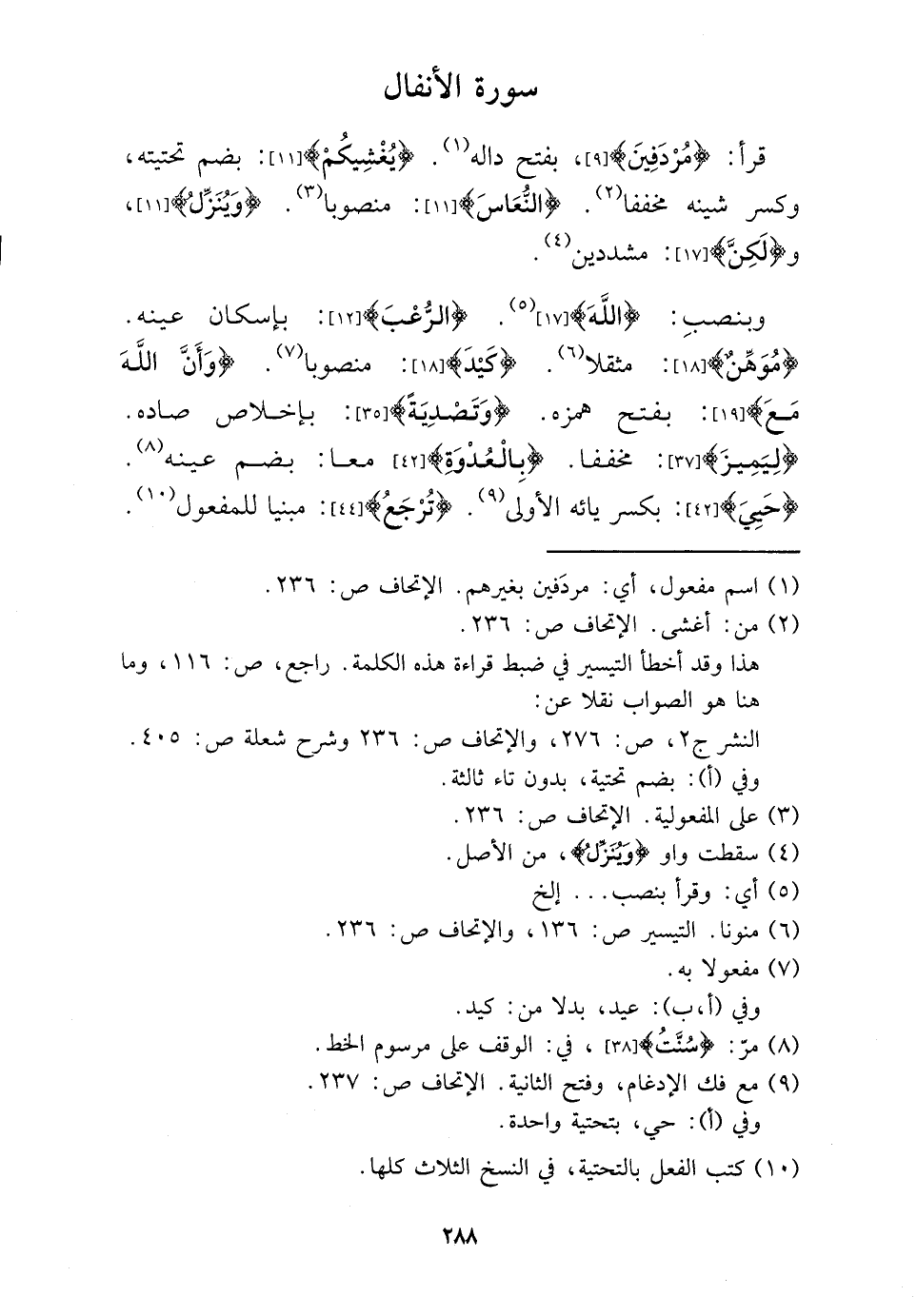 وبنصب: {الله} . {الرعب} : بِإِسْكَان عينه. {موهن} : مُثقلًا. {كيد} : مَنْصُوبًا. {وَأَن الله مَعَ} : بِفَتْح همزه. {وتصدية} : بإخلاص صَاده. {ليميز} : مخففا. {بالعدوة} مَعًا: بِضَم عينه. {حييّ} : بِكَسْر يائه الأولى. {ترجع} : مَبْنِيا للْمَفْعُول.
