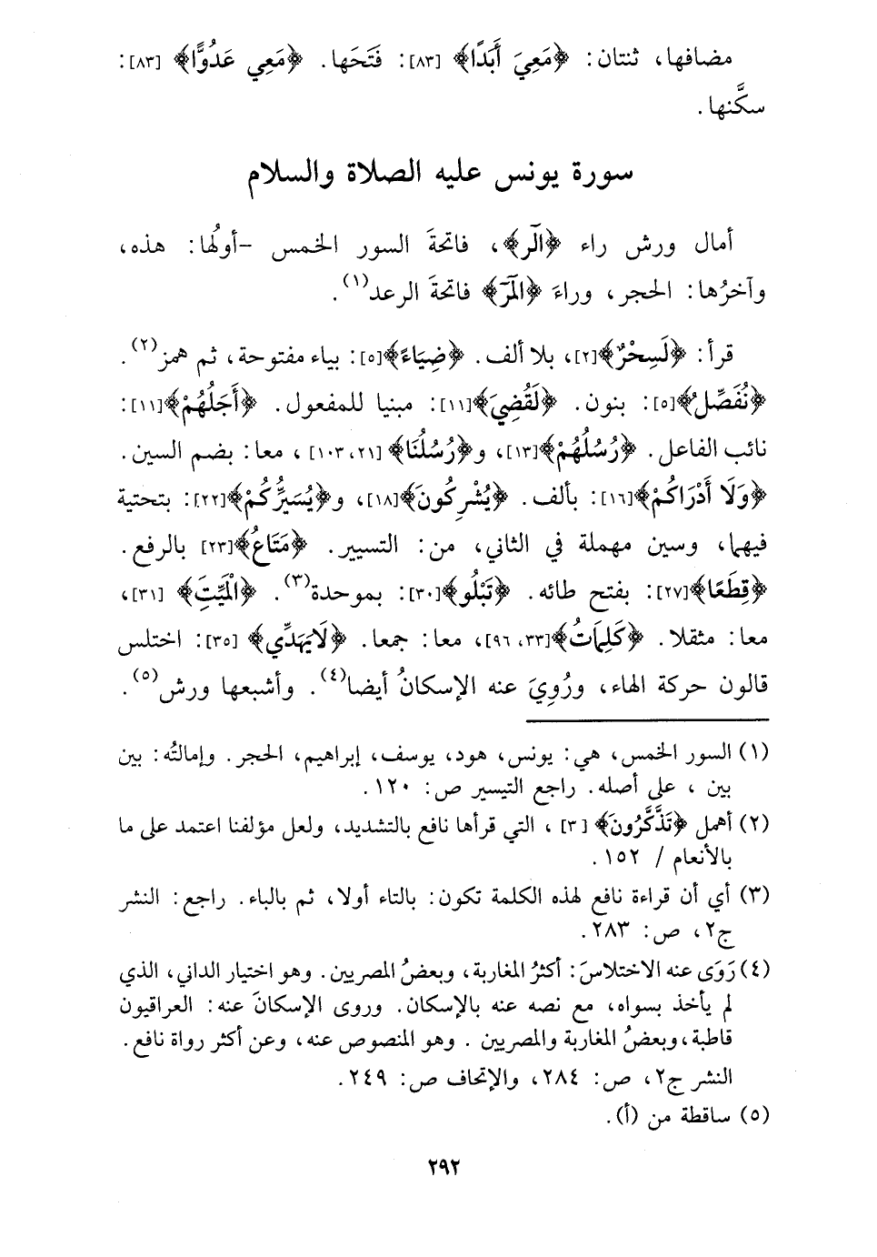 قَرَأَ: {لسحر} ، بِلَا ألف. {ضِيَاء} : بياء مَفْتُوحَة، ثمَّ همز. {نفصل} : بنُون. {لقضي} : مَبْنِيا للْمَفْعُول. {أَجلهم} : نَائِب الْفَاعِل. {رسلهم} ، و {رسلنَا} ، مَعًا: بِضَم السِّين. {وَلَا أدراكم} : بِأَلف. {يشركُونَ} ، و {يسيركم} : بتحتية فيهمَا، وسين مُهْملَة فِي الثَّانِي، من: التسيير. {مَتَاع} بِالرَّفْع. {قطعا} : بِفَتْح طائه. {تبلو} : بموحدة. {الْمَيِّت} ، مَعًا: مُثقلًا. {كَلِمَات} ، مَعًا: جمعا. {لَا يهدي} : اختلس قالون حَرَكَة الْهَاء، وَرُوِيَ عَنهُ الإسكان أَيْضا. وأشبعها ورش.
