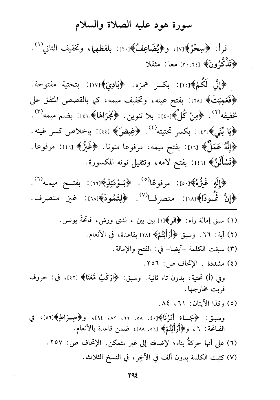 {إِنِّي لكم} : بِكَسْر همزه. {بَادِي} : بتحتية مَفْتُوحَة. {فعميت} : بِفَتْح عينه، وَتَخْفِيف ميمه، كَمَا بالقصص الْمُتَّفق على تخفيفه. {من كل} : بِلَا تَنْوِين. {مجْراهَا} : بِضَم ميمه. {يَا بني} : بِكَسْر تحتيته. {غيض} : بإخلاص كسر غينه. {إِنَّه عمل} : بِفَتْح ميمه، مَرْفُوعا منونا، {غير} : مَرْفُوعا. {تسألن} : بِفَتْح لامه، وتثقيل نونه الْمَكْسُورَة. {إِلَه غَيره} : مَرْفُوعا. {يَوْمئِذٍ} : بِفَتْح ميمه. {إِن ثموداً} : منصرفا. {لثمود} : غير منصرف.