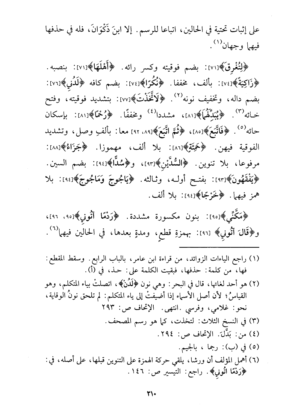 على إِثْبَات تحتية فِي الْحَالين، اتبَاعا للرسم. إِلَّا ابْن ذكْوَان، فَلهُ فِي حذفهَا فيهمَا وَجْهَان.