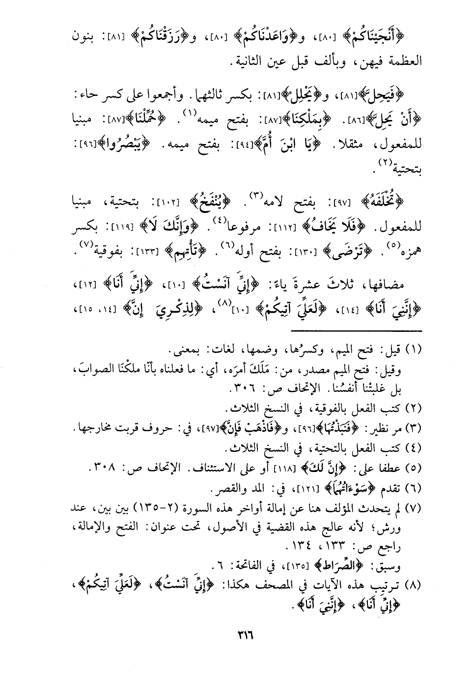 {فَيحل} ، و {يحلل} : بِكَسْر ثالثهما. وَأَجْمعُوا على كسر حاء: {أَن يحل} . {بملكنا} : بِفَتْح ميمه. {حملنَا} : مَبْنِيا للْمَفْعُول، مُثقلًا. {يَا ابْن أم} : بِفَتْح ميمه. {يبصروا} : بتحتية.