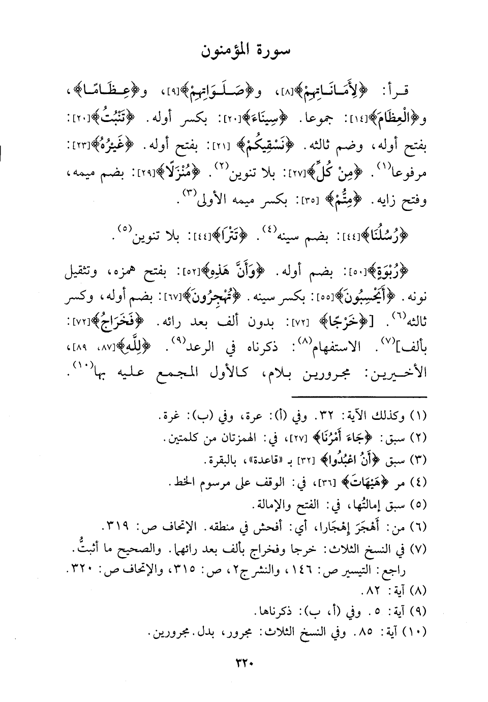 {ربوة} : بِضَم أَوله. {وَأَن هَذِه} : بِفَتْح همزه، وتثقيل نونه. {أيحسبون} : بِكَسْر سينه. {تهجرون} : بِضَم أَوله، وَكسر ثالثه. [ {خرجا} : بِدُونِ ألف بعد رائه. {فخراج} : بِأَلف] . الِاسْتِفْهَام: ذَكرْنَاهُ فِي الرَّعْد. {لله} ، الْأَخيرينِ: مجرورين بلام، كَالْأولِ الْمجمع عَلَيْهِ بهَا.