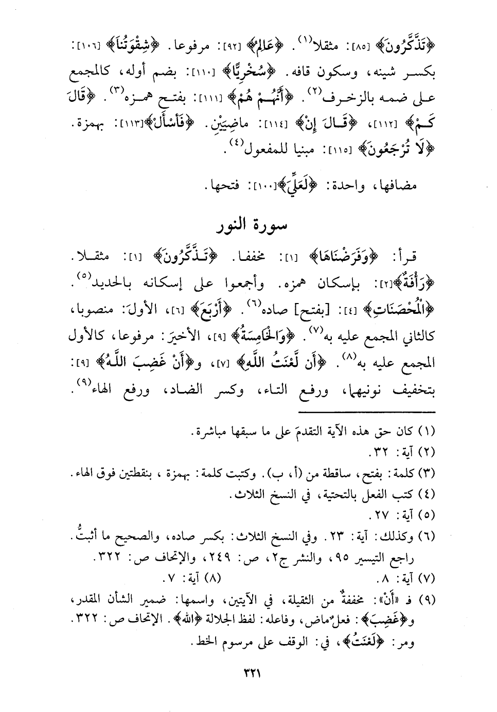 قَرَأَ: {وفرضناها} : مخففا. {تذكرُونَ} : مُثقلًا. {رأفة} : بِإِسْكَان همزه. وَأَجْمعُوا على إسكانه بالحديد. {الْمُحْصنَات} : [بِفَتْح] صَاده. {أَربع} ، الأول: مَنْصُوبًا، كالثاني الْمجمع عَلَيْهِ بِهِ. {وَالْخَامِسَة} ، الْأَخير: مَرْفُوعا، كَالْأولِ الْمجمع عَلَيْهِ بِهِ. {أَن لعنت الله} و {أَن غضب الله} : بتَخْفِيف نونيهما، وَرفع التَّاء، وَكسر الضَّاد، وَرفع الْهَاء.