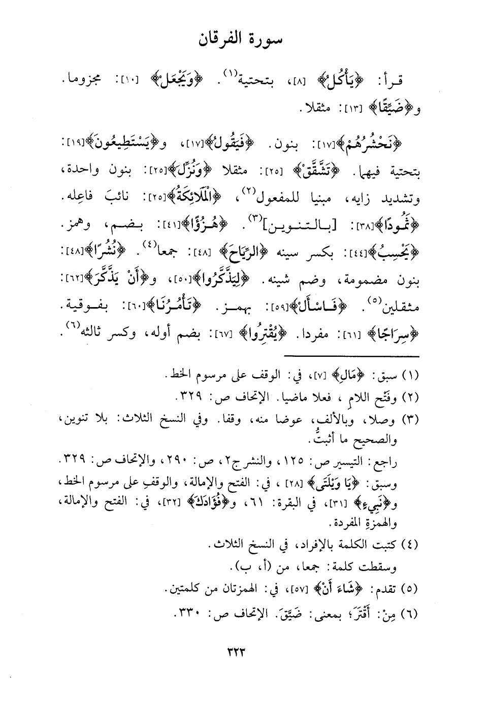 {نحشرهم} : بنُون. {فَيَقُول} ، و {يَسْتَطِيعُونَ} : بتحتية فيهمَا. {تشقق} : مُثقلًا {وَنزل} : بنُون وَاحِدَة، وَتَشْديد زايه، مَبْنِيا للْمَفْعُول، {الْمَلَائِكَة} : نَائِب فَاعله. {ثموداً} : [بِالتَّنْوِينِ] . {هزؤاً} : بِضَم، وهمز. {يحْسب} : بِكَسْر سينه {الرِّيَاح} : جمعا. {نشرا} : بنُون مَضْمُومَة، وَضم شينه. {لِيذكرُوا} ، و {أَن يذكر} : مثقلين. {فاسأل} : بهمز. {تَأْمُرنَا} : بفوقية. {سِرَاجًا} : مُفردا. {يقترُوا} : بِضَم أَوله، وَكسر ثالثه.