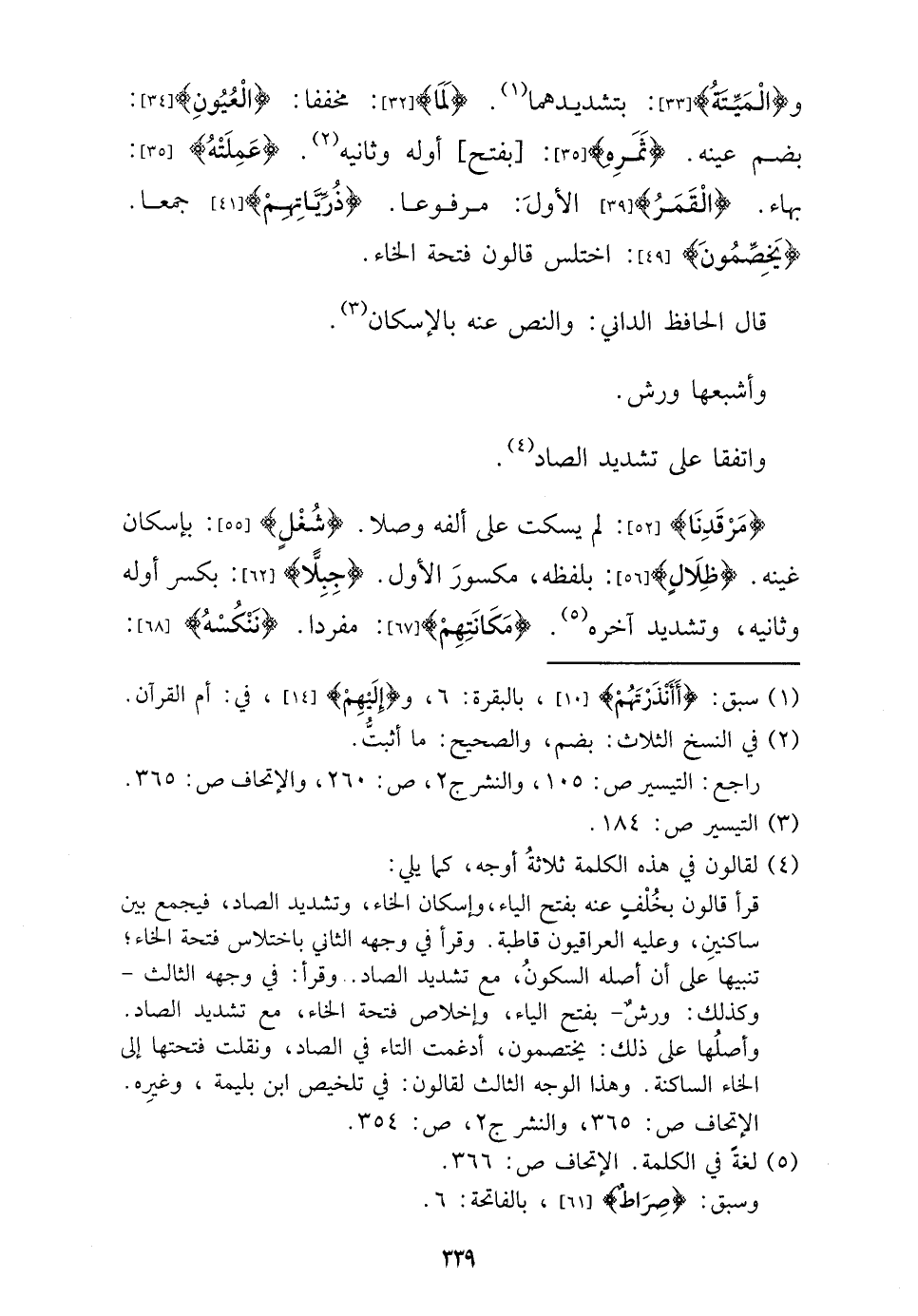 و {الْميتَة} : بتشديدهما. {لما} : مخففا: {الْعُيُون} : بِضَم عينه. {ثمره} : [بِفَتْح] أَوله وثانيه. {عملته} : بهاء. {الْقَمَر} الأول: مَرْفُوعا. {ذرياتهم} جمعا. {يخصمون} : اختلس قالون فَتْحة الْخَاء.