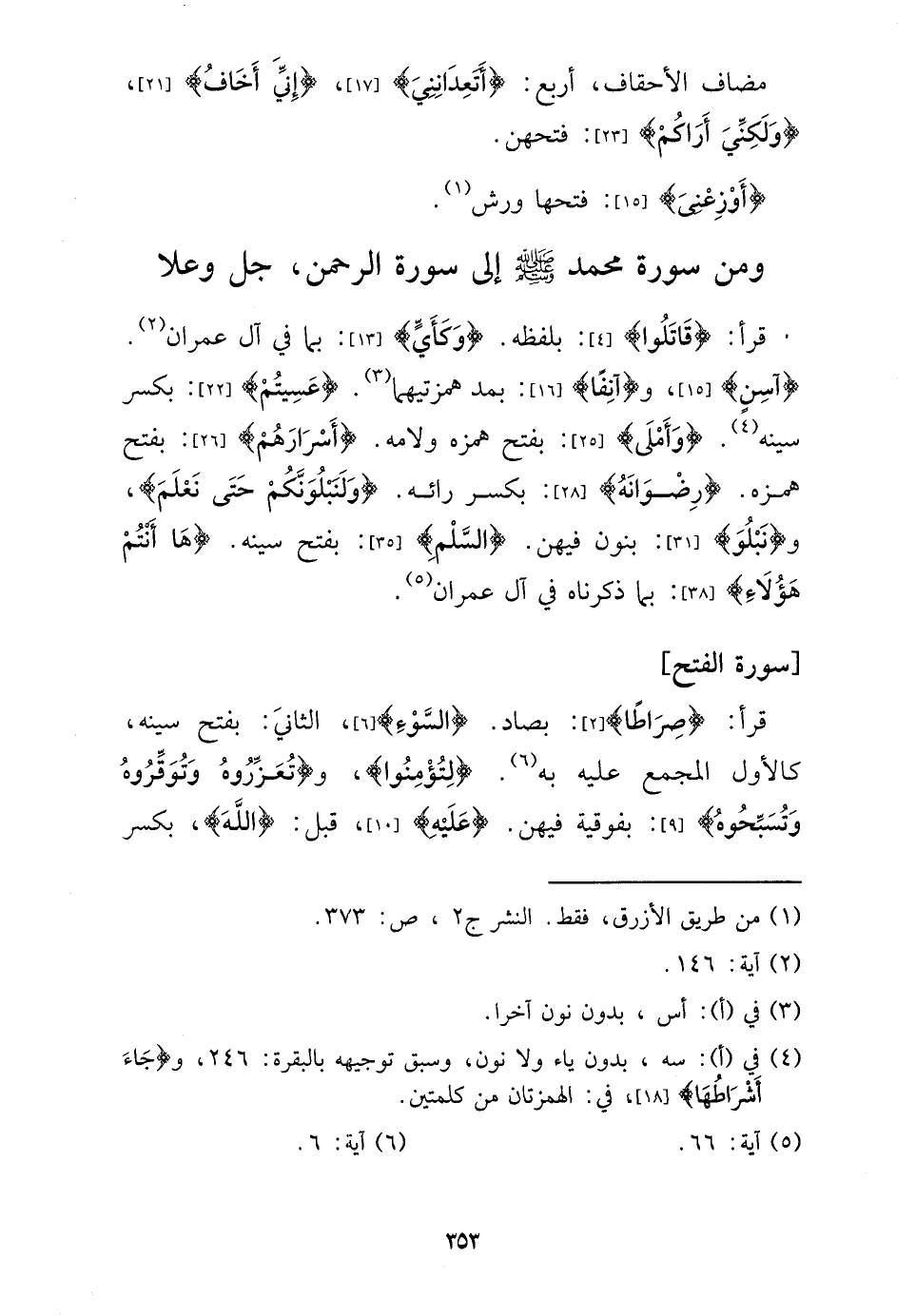 قَرَأَ: {صراطاً} : بصاد. {السوء} ، الثَّانِي: بِفَتْح سينه، كَالْأولِ الْمجمع عَلَيْهِ بِهِ. {لتؤمنوا} ، و {تعزروه وتوقروه وتسبحوه} : بفوقية فِيهِنَّ. {عَلَيْهِ} ، قبل: {الله} ، بِكَسْر