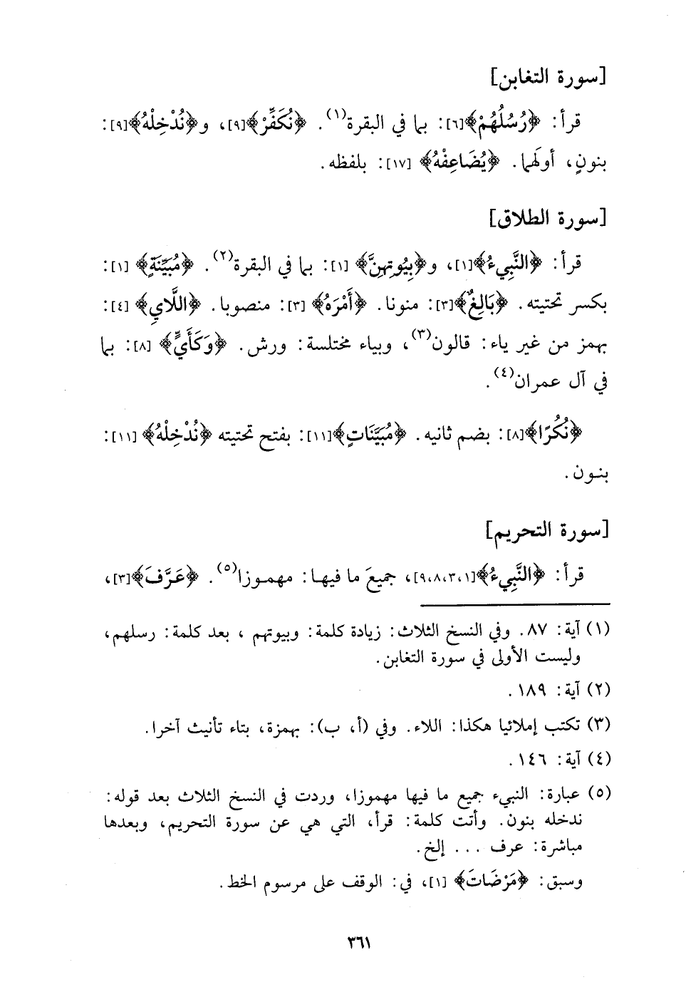 قَرَأَ: {رسلهم} : بِمَا فِي الْبَقَرَة. {نكفر} ، و {ندخله} : بنُون، أَولهمَا. {يضاعفه} : بِلَفْظِهِ.