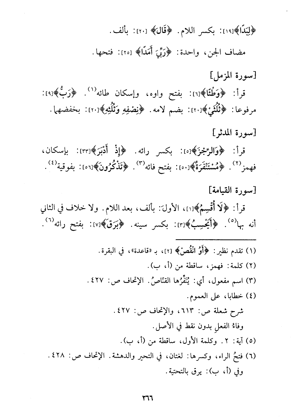 قَرَأَ: {لَا أقسم} ، الأول: بِأَلف، بعد اللَّام. وَلَا خلاف فِي الثَّانِي أَنه بهَا. {أيحسب} : بِكَسْر سينه. {برق} : بِفَتْح رائه.