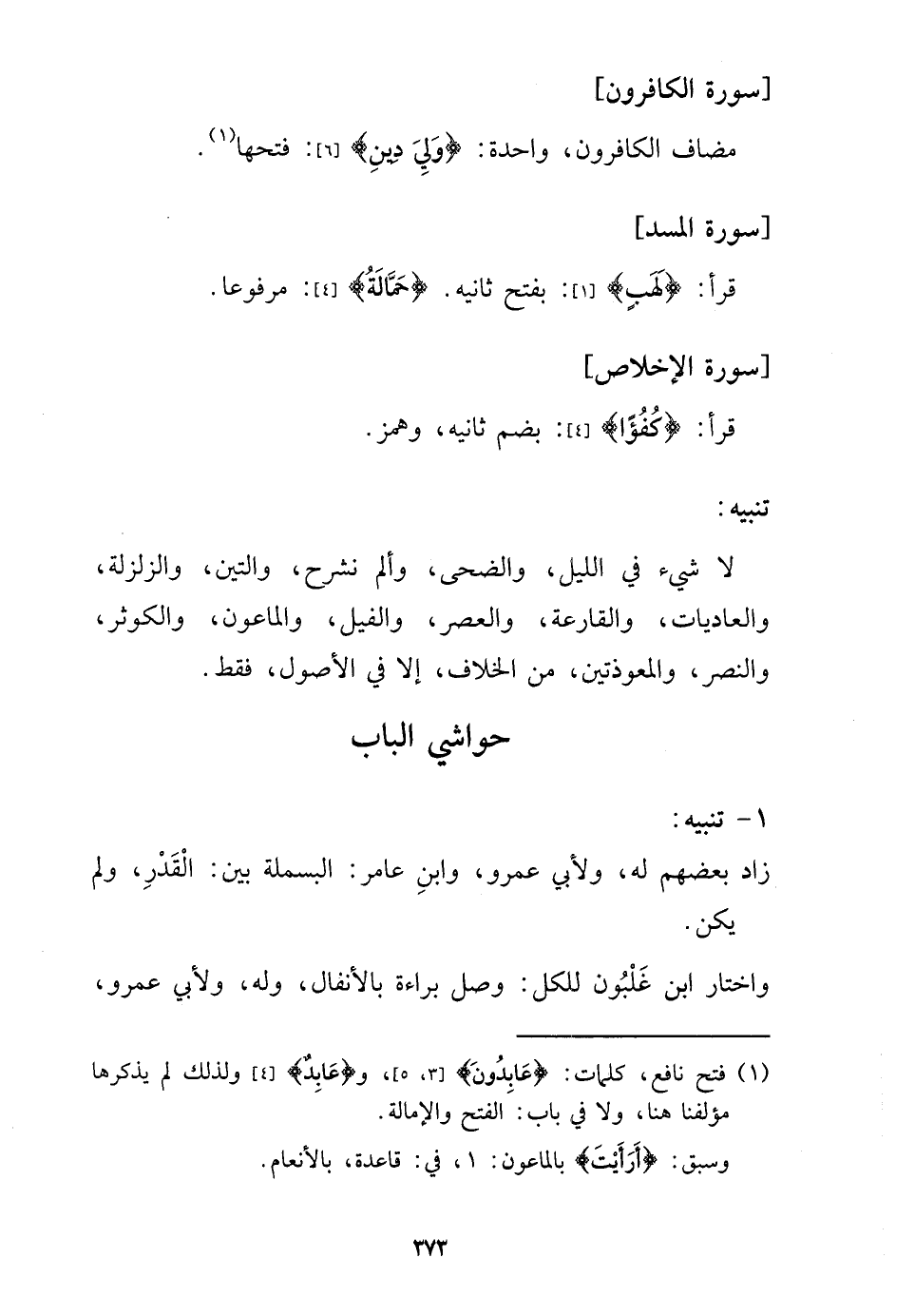 لَا شَيْء فِي اللَّيْل، وَالضُّحَى، وألم نشرح، والتين، والزلزلة، وَالْعَادِيات، وَالْقَارِعَة، وَالْعصر، والفيل، والماعون، والكوثر، والنصر، والمعوذتين، من الْخلاف، إِلَّا فِي الْأُصُول، فَقَط.