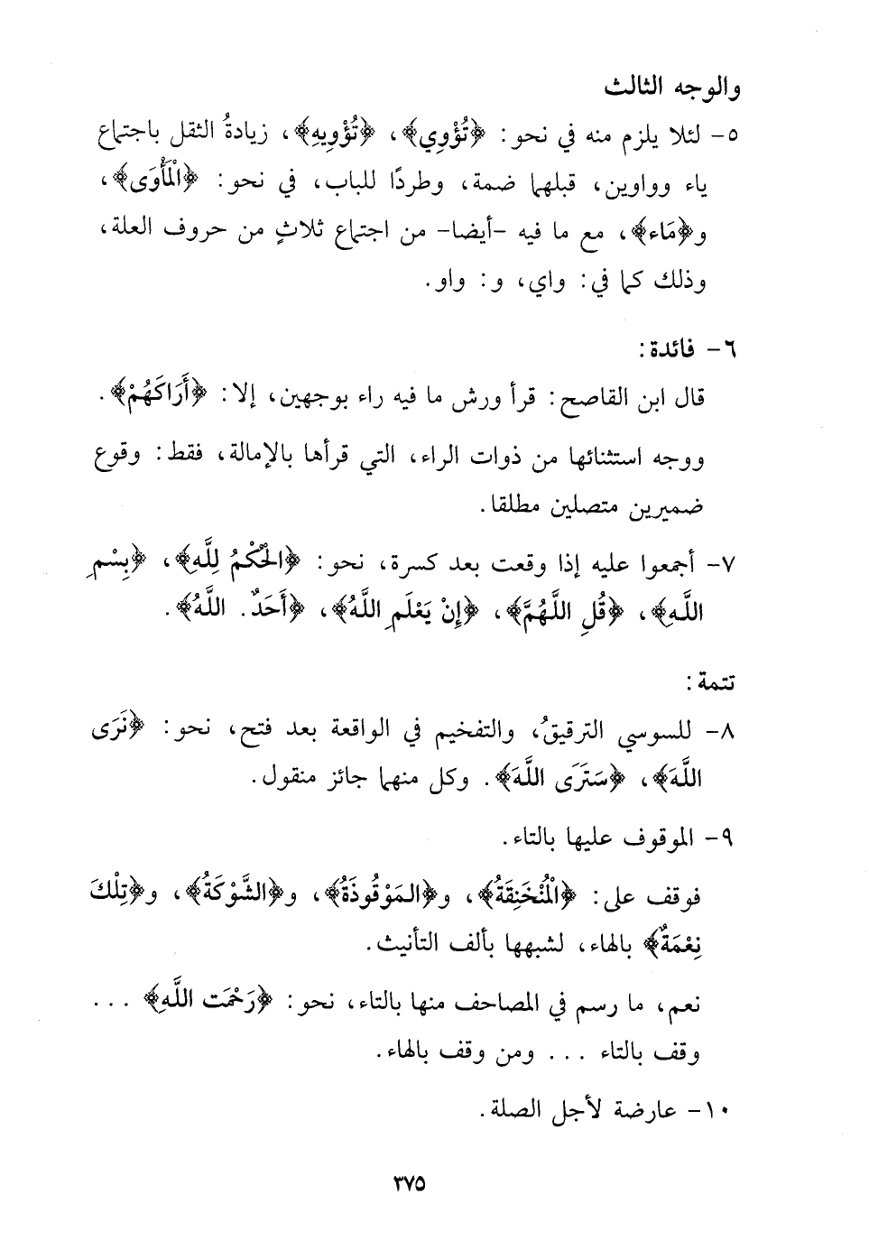 6 - فَائِدَة: قَالَ ابْن القاصح: قَرَأَ ورش مَا فِيهِ رَاء بِوَجْهَيْنِ، إِلَّا: {أراكهم} . وَوجه استثنائها من ذَوَات الرَّاء، الَّتِي قَرَأَهَا بالإمالة، فَقَط: وُقُوع ضميرين متصلين مُطلقًا.