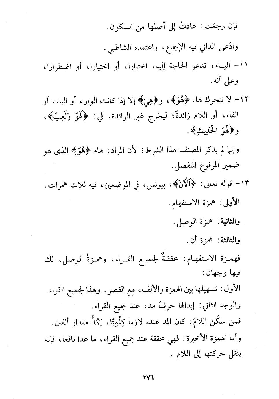 12 - لَا تتحرك هَاء {هُوَ} ، و {هِيَ} إِلَّا إِذا كَانَت الْوَاو، أَو الْيَاء، أَو الْفَاء، أَو اللَّام زَائِدَة؛ ليخرج غير الزَّائِدَة، فِي: {لَهو وَلعب} ، و {لَهو الحَدِيث} .