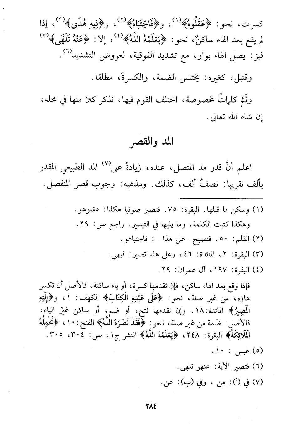 كسرت، نَحْو: {عقلوه} ، و {فاجتباه} ، و {فِيهِ هدى} ، إِذا لم يَقع بعد الْهَاء سَاكن، نَحْو: {يُعلمهُ الله} ، إِلَّا: {عَنهُ تلهى} فبز: يصل الْهَاء بواو، مَعَ تَشْدِيد الْفَوْقِيَّة، لعروض التَّشْدِيد.