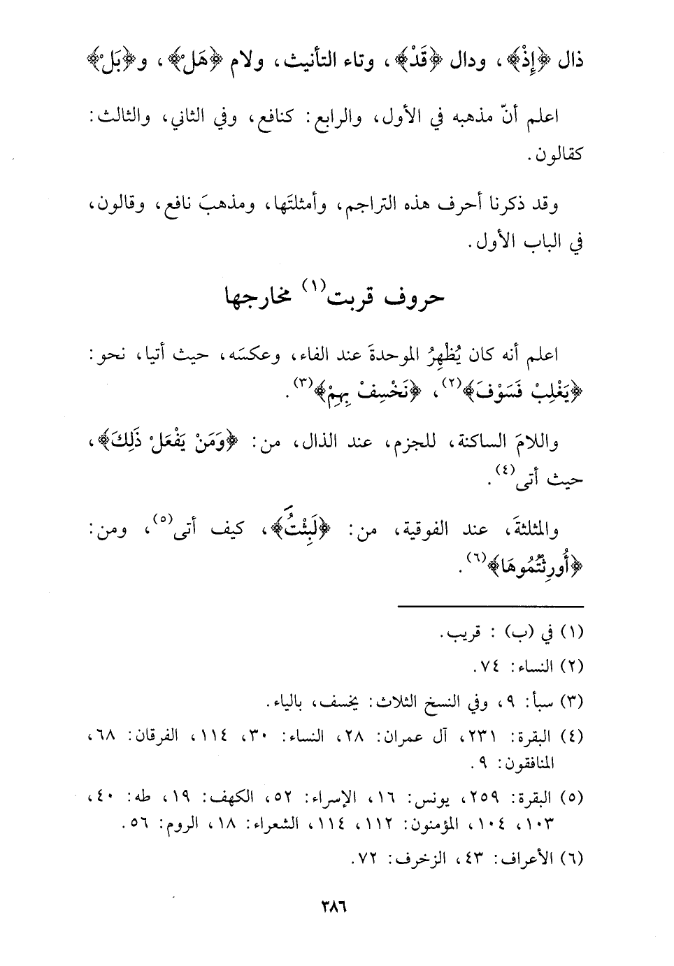 وَقد ذكرنَا أحرف هَذِه التراجم، وأمثلتها، وَمذهب نَافِع، وقالون، فِي الْبَاب الأول.