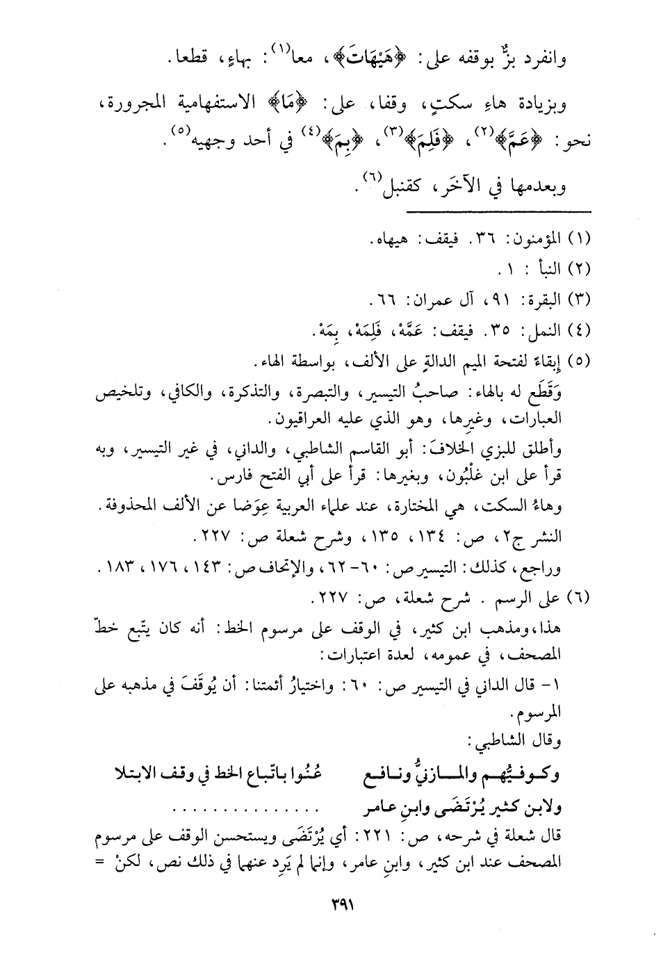 وَبِزِيَادَة هَاء سكت، وَقفا، على: {مَا} الإستفهامية المجرورة، نَحْو: {عَم} ، {فَلم} ، {بِمَ} فِي أحد وجهيه.