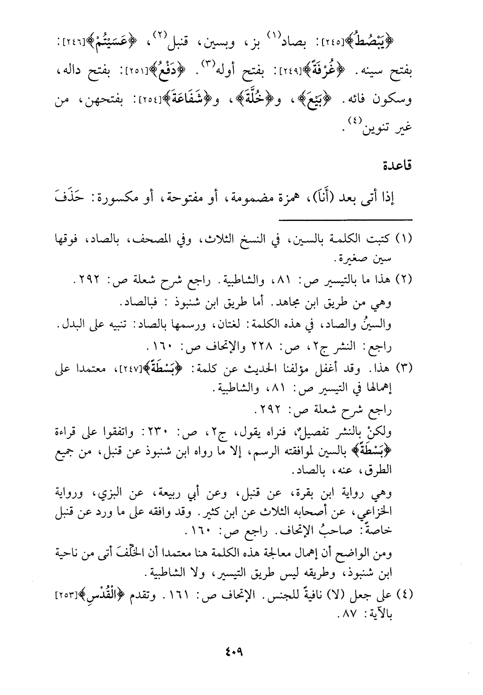 {يبصط} : بصاد بز، وبسين، قنبل، {عسيتم} : بِفَتْح سينه. {غرفَة} : بِفَتْح أَوله. {دفع} : بِفَتْح داله، وَسُكُون فائه. {بيع} ، و {خلة} ، و {شَفَاعَة} : بفتحهن، من غير تَنْوِين.