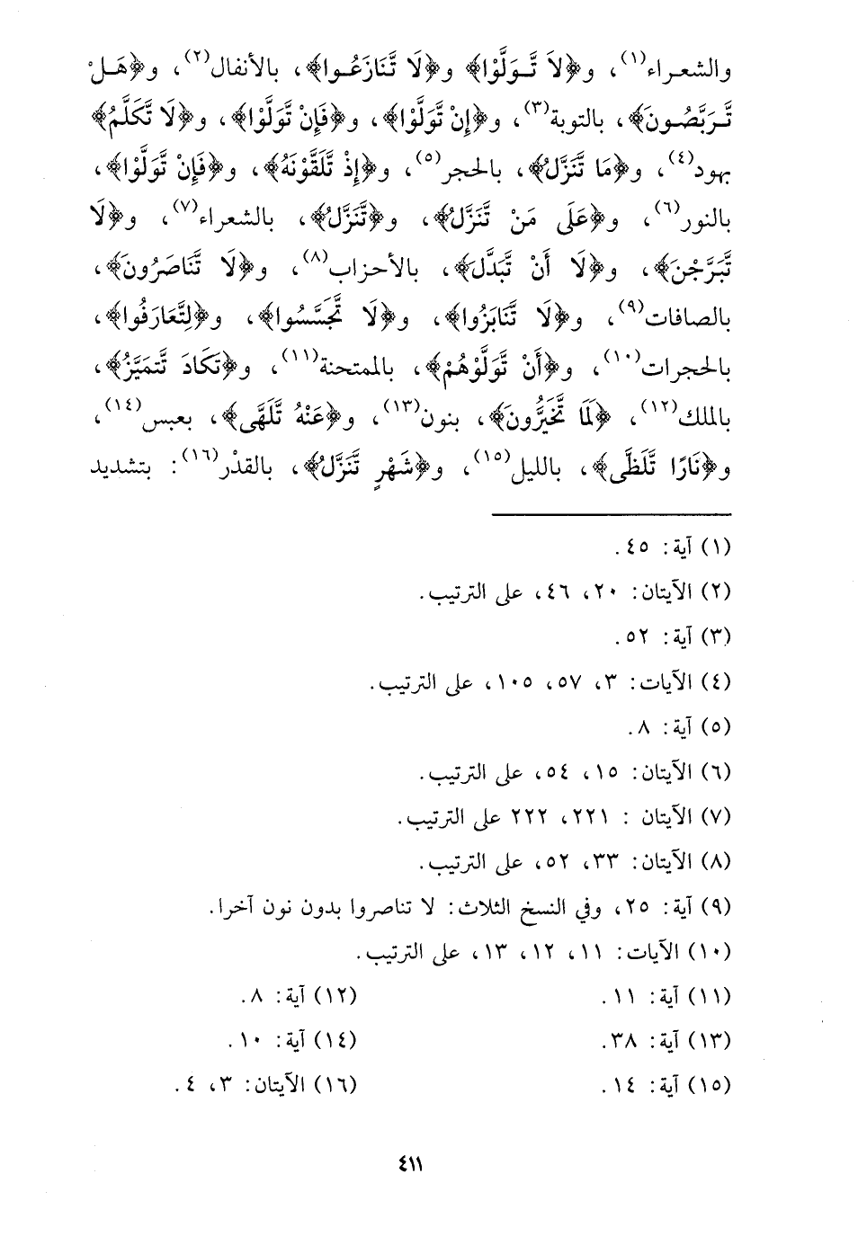 وَالشعرَاء، و {لَا توَلّوا} ، و {لَا تنازعوا} ، بالأنفال، و {هَل تربصون} ، بِالتَّوْبَةِ، و {إِن توَلّوا} ، و {فَإِن توَلّوا} ، و {لَا تكلم} بهود، و {مَا تنزل} ، بِالْحجرِ، و {إِذْ تلقونه} ، و {فَإِن توَلّوا} ، بِالنورِ، و {على من تنزل} ، و {تنزل} ، بالشعراء، و {لَا تبرجن} ، و {لَا أَن تبدل} ، بالأحزاب، و {لَا تناصرون} ، بالصافات، و {لَا تنابزوا} ، و {لَا تجسسوا} ، و {لتعارفوا} ، بالحجرات، و {أَن تولوهم} ، بالممتحنة، و {تكَاد تتَمَيَّز} ، بِالْملكِ، {لما تخيرون} ، بنُون، و {عَنهُ تلهى} ، بعبس، و {نَارا تلظى} ، بِاللَّيْلِ، و {شهر تنزل} ، بِالْقدرِ: بتَشْديد