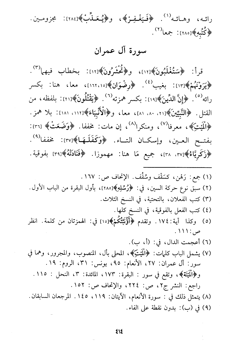 قَرَأَ: {ستغلبون} ، و {تحشرون} : بخطاب فيهمَا. {يرونهم} : بِغَيْب. {رضوَان} ، مَعًا، هُنَا: بِكَسْر رائه. {إِن الدّين} : بِكَسْر همزته. {يقتلُون} : بِلَفْظِهِ، من الْقَتْل. {النَّبِيين} ، مَعًا، و {الْأَنْبِيَاء} : بِلَا همز. {الْمَيِّت} ، مُعَرفا، ومنكرا، إِن مَاتَ: مخففا. {وضعت} : بِفَتْح الْعين، وَإِسْكَان التَّاء. {وكلفها} : مخففا. {زَكَرِيَّاء} ، جَمِيع مَا هُنَا: مهموزا. {فنادته} بفوقية.