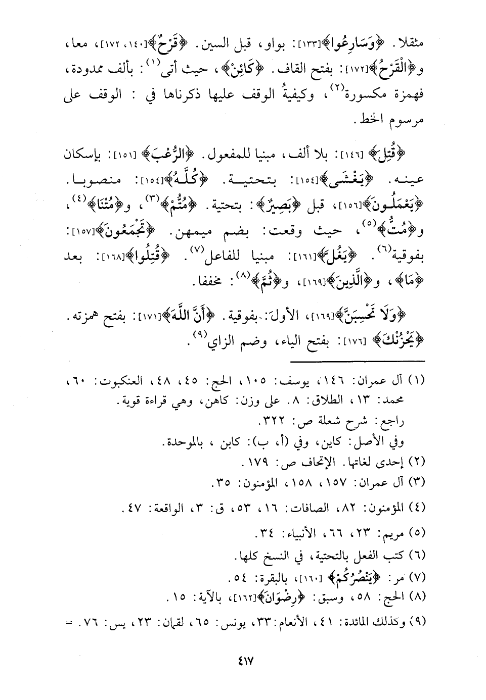 مُثقلًا. {وسارعوا} : بواو، قبل السِّين. {قرح} ، مَعًا، و {الْقرح} : بِفَتْح الْقَاف. {كَائِن} ، حَيْثُ أَتَى: بِأَلف ممدودة، فهمزة مَكْسُورَة، وَكَيْفِيَّة الْوَقْف عَلَيْهَا ذَكرنَاهَا فِي: الْوَقْف على مرسوم الْخط.