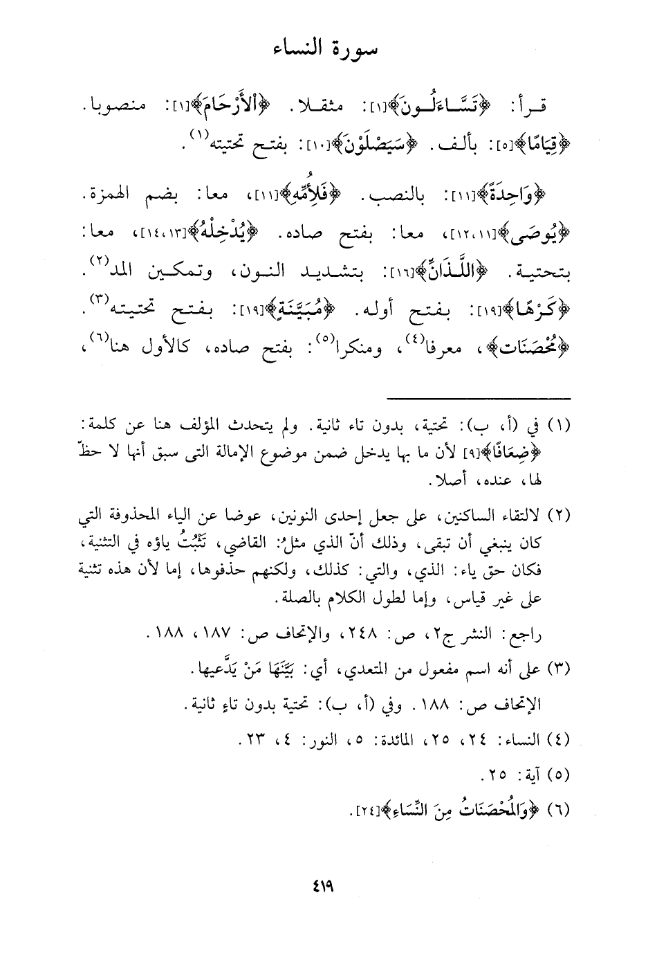 {وَاحِدَة} : بِالنّصب. {فلأمه} ، مَعًا: بِضَم الْهمزَة. {يوصى} ، مَعًا: بِفَتْح صَاده. {يدْخلهُ} ، مَعًا: بتحتية. {اللَّذَان} : بتَشْديد النُّون، وتمكين الْمَدّ. {كرها} : بِفَتْح أَوله. {مبينَة} : بِفَتْح تحتيته. {محصنات} ، مُعَرفا، ومنكرا: بِفَتْح صَاده، كَالْأولِ هُنَا،