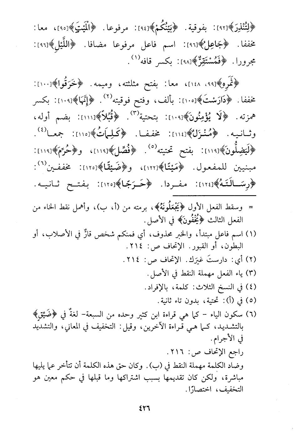 {ثمره} ، مَعًا: بِفَتْح مثلثته، وميمه. {خرقوا} : مخففا. {دراست} : بِأَلف، وَفتح فوقيته. {إِنَّهَا} : بِكَسْر همزته. {لَا يُؤمنُونَ} : بتحتية. {قبلا} : بِضَم أَوله، وثانيه. {منزل} : مخففا. {كَلِمَات} : جمعا. {ليضلون} : بِفَتْح تحتيته. {فصل} ، و {حرم} : مبنيين للْمَفْعُول. {مَيتا} ، و {ضيقا} : مخففين: {رسَالَته} : مُفردا. {حرجا} : بِفَتْح ثَانِيه.