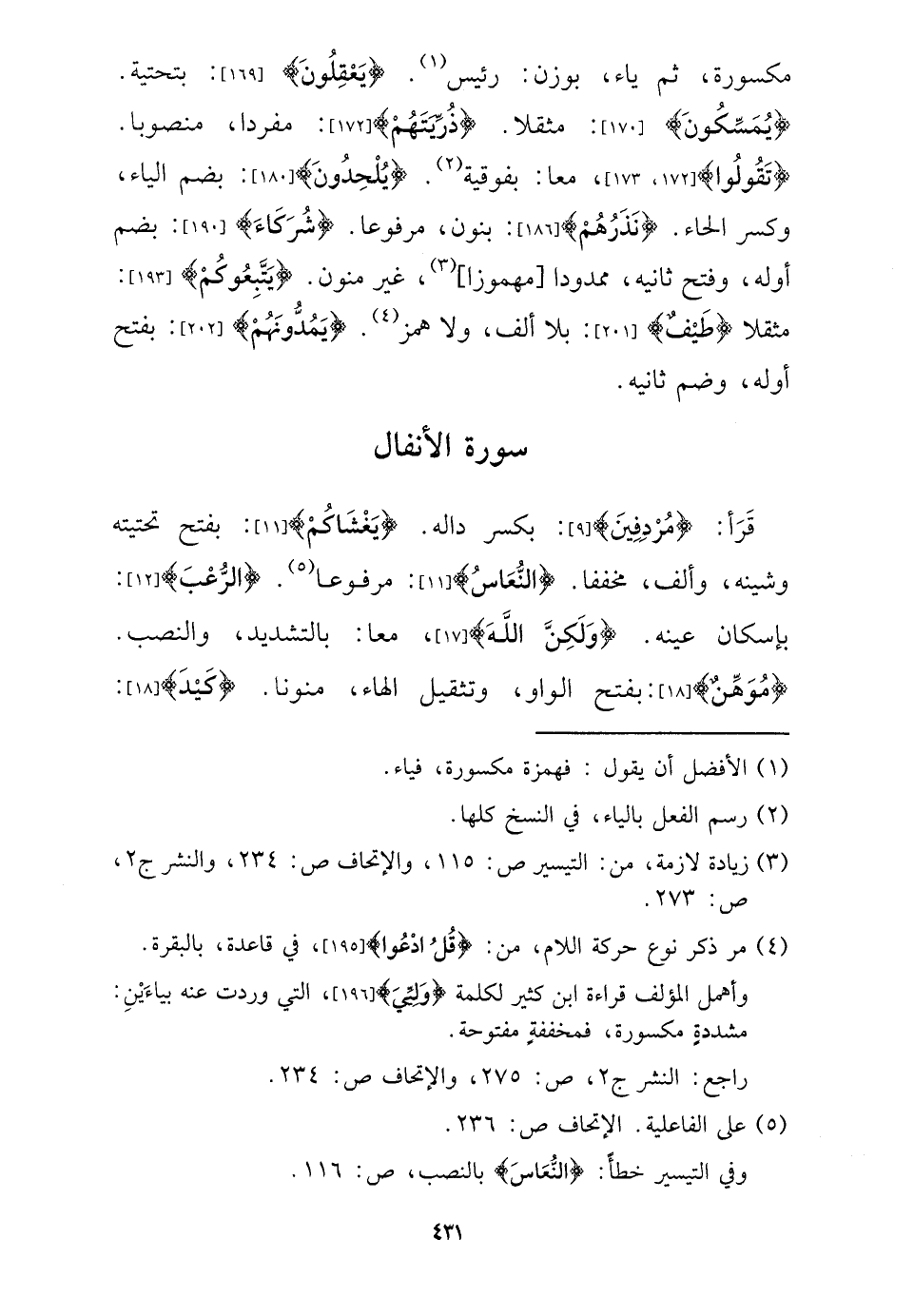 مَكْسُورَة، ثمَّ يَاء، بِوَزْن: رَئِيس. {يعْقلُونَ} : بتحتية. {يمكسون} : مُثقلًا. {ذُرِّيتهمْ} : مُفردا، مَنْصُوبًا. {تَقولُوا} ، مَعًا: بفوقية. {يلحدون} : بِضَم الْيَاء، وَكسر الْحَاء. {نذرهم} : بنُون، مَرْفُوعا. {شُرَكَاء} : بِضَم أَوله، وَفتح ثَانِيَة، ممدودا [مهموزا] ، غير منون. {يتبعوكم} : مُثقلًا {طيف} : بِلَا ألف، وَلَا همز. {يمدونهم} : بِفَتْح أَوله، وَضم ثَانِيه.