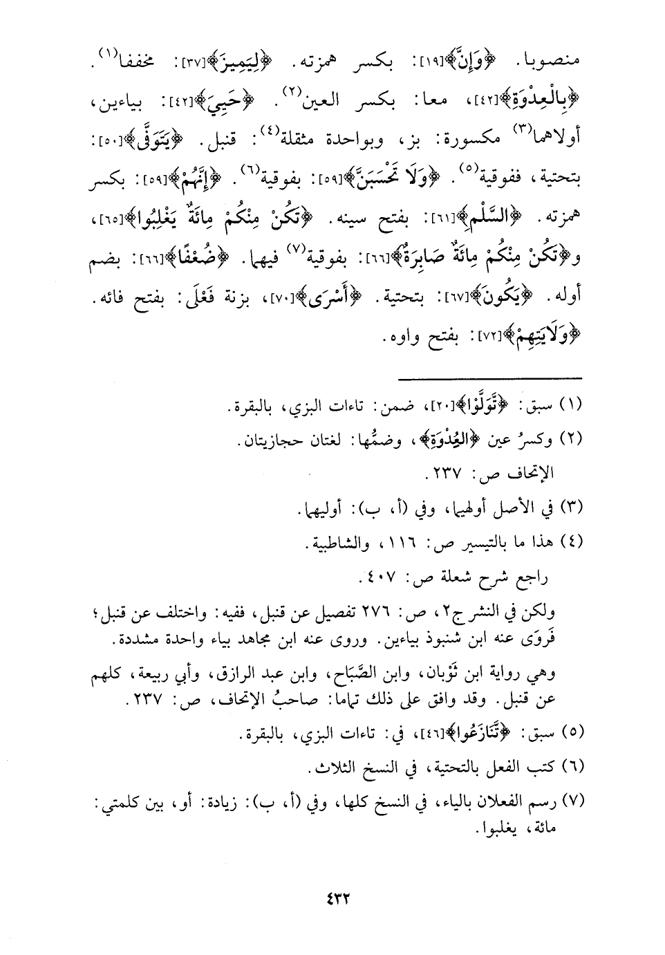 مَنْصُوبًا. {وَإِن} : بِكَسْر همزته. {ليميز} : مخففا. {بالعدوة} ، مَعًا: بِكَسْر الْعين. {حييّ} : بياءين، أولاهما مَكْسُورَة: بز، وبواحدة مثقلة: قنبل. {يتوفى} : بتحتية، ففوقية. {وَلَا تحسبن} : بفوقية. {إِنَّهُم} : بِكَسْر همزته. {السّلم} : بِفَتْح سينه. {تكن مِنْكُم مائَة يغلبوا} ، و {تكن مِنْكُم مائَة صابرة} : بوفية فيهمَا. {ضعفا} : بِضَم أَوله. {يكون} : بتحتية. {أسرى} ، بزنة فعلى: بِفَتْح فائه. {ولايتهم} : بِفَتْح واوه.